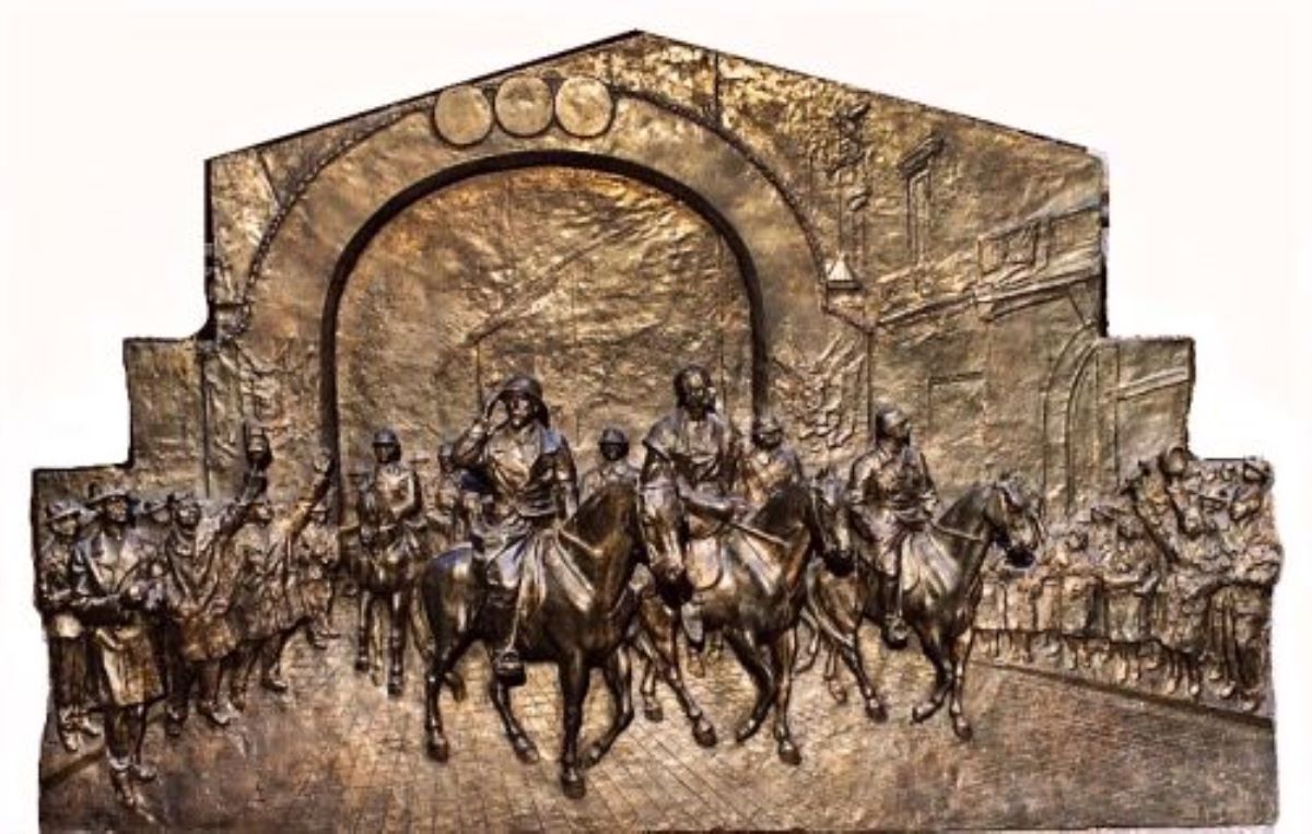 Descriere: Basorelieful reprezintă un alai care trece pe sub un arc de triumf improvizat, în partea superioară, în unghi. În fruntea alaiului se află suveranii, urmați de șase ofițeri, toți călări. Regele Ferdinand este în uniformă, cu manta și cască, și salută mulțimea; alături se află Regina Maria. De ambele părți ale drumului se văd cetățeni, care au brațele ridicate, unii cu pălării în mâini. În stânga se văd în perspectivă și clădiri cu etaj.