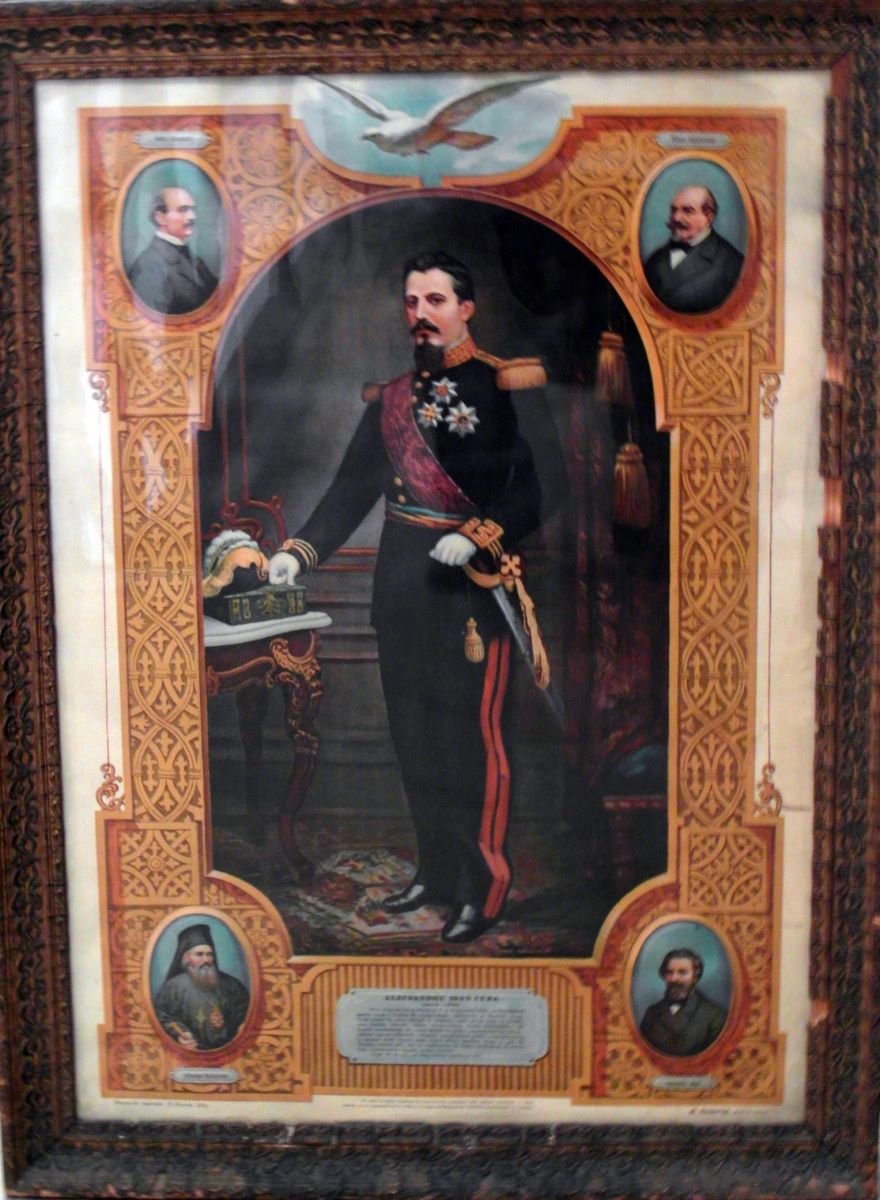 Descriere: Domnitorul este reprezentat în picioare, din semiprofil spre stânga, privind frontal; poartă uniformă neagră; mâna dreaptă cu pumnul strâns pe o carte aflată pe o masă, în stânga; lângă carte este bicornul cu pene; fundal cu panori decorate cu baghete și stucaturi și o draperie în dreapta. Portretul are un cadru gen ramă cu patru medalioane la colțuri, fiecare cu inscripție: stânga sus: V. Alecsandri; dreapta sus: M. Cogălniceanu; stânga jos: Episcopul Melchisedek; dreapta jos: Constantin Negri. Sus mijloc un porumbel alb pe cerul albastru. Litografia reproduce una dintre fotografiile domnitorului executate de Carol Popp de Szathmari, care i-au servit ca model pentru portretul oficial litografiat în 1851. Portret pereche cu cel al Elenei Cuza, MNIR inv. 150539. Inscripții litografiate sub cadru, stânga: Drepturile reservate T. Severin 1909; dreapta: Al. Resmeriță profesor-pictor; mijloc: Pe când se făcea alegerea lui Cuza în Iași, mulțimea care aștepta rezultatul, a ținut / aminte că un porumbel se tot rotea și se așeza pe frontispiciul Palatului Aministrativ. (v. Istoria). Inscripție litografiată într-un cartuș, sub portret: ALECSANDRU IOAN CUZA / 1859-1866 / Prin alegerea sa ca Domn la 5 și 24 Ianuarie 1859, se făcu Unirea [...].