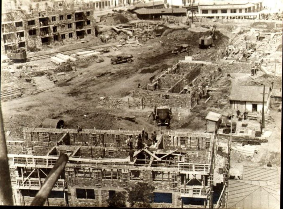Descriere: Fotografia surprinde reconstrucția zonei centrale a orașului Piatra-Neamț (amenajarea Bd. Chimiei, ulterior redenumit Mihai Eminescu).