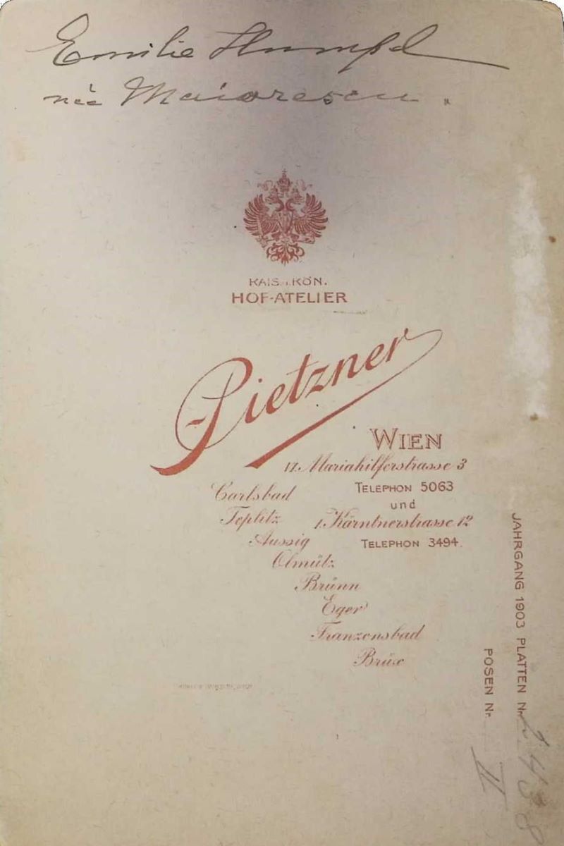 Descriere: Este o fotografie veche, valoroasă, produs al unui renumit atelier fotografic, de epocă, existent la Viena, spre sfârșitul secolului al XIX- lea, care reprezintă portretul deosebit de valoros, al Emiliei Humpel (n. Maiorescu); ea și soțul său, nu numai fratele său, au făcut parte dintre apropiații lui Eminescu, poetul fiind profesor pentru o perioadă scurtă la pensionul Humpel; l-a cunoscut realmente pe tânărul Eminescu; a fost cea care a insistat pentru a fi trimis în străinătate, la tratament; a organizat concerte de strângere de fonduri pentru tratamentul poetului etc.