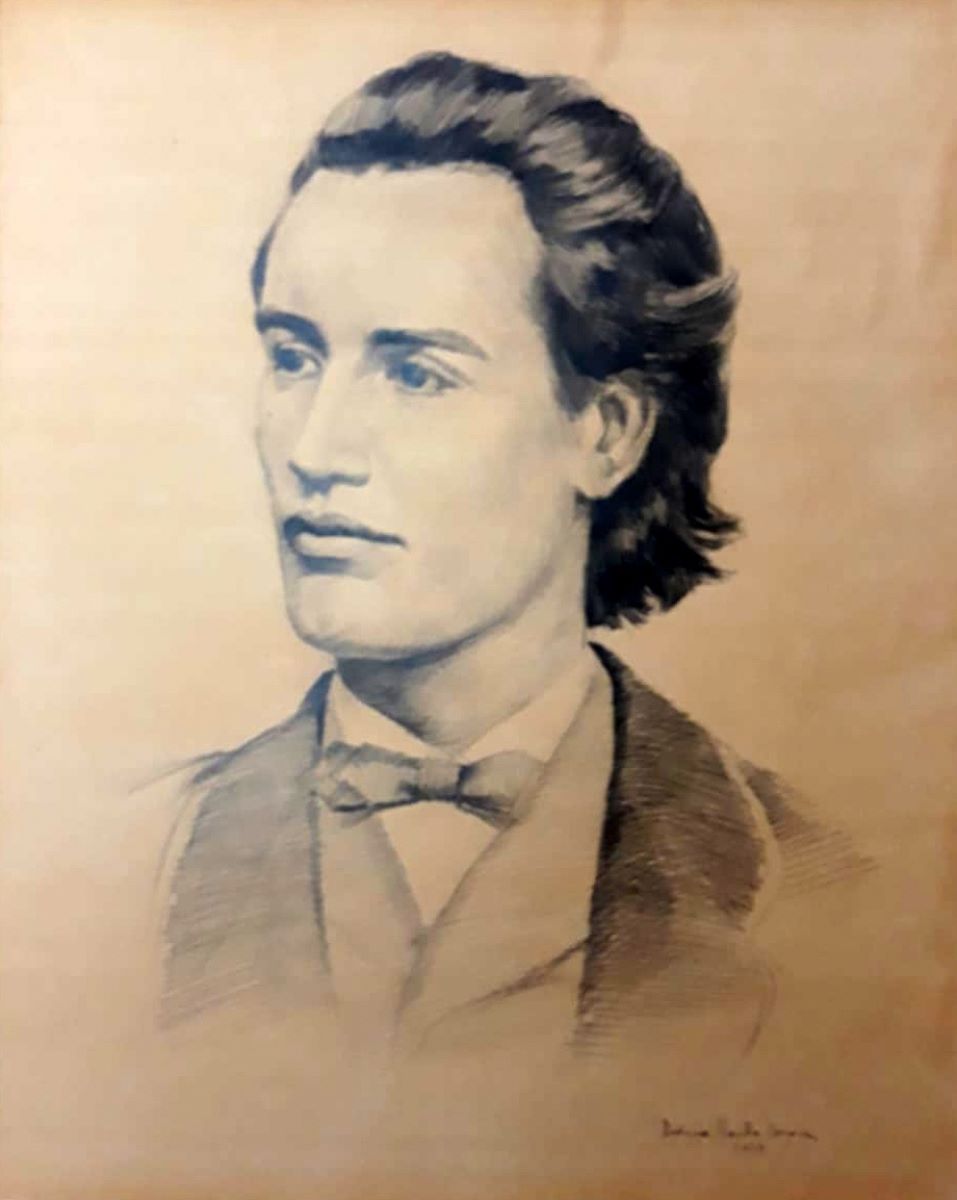 Descriere: Portretul binecunoscut al poetului Mihai Eminescu, reprezentat din față, ușor orientat spre stânga. Lucrarea se remarcă prin acuratețea redării detaliilor fizionomiei.