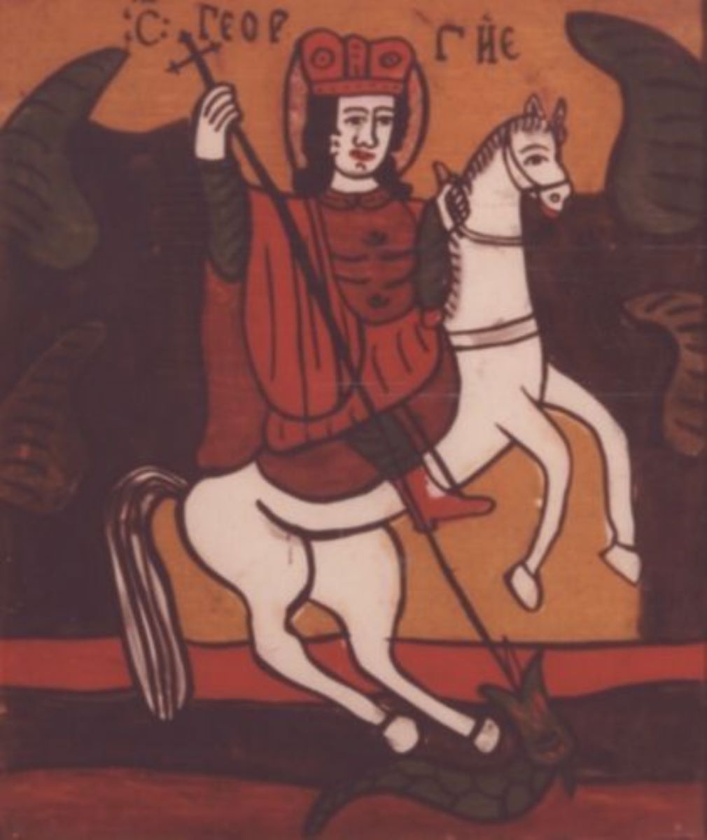 Descriere: Icoana prezintă în mod sintetic pe Sfântul Gheorghe în ipostaza clasică, ucigând balaurul. Mucenicul călare pe cal alb, cabrat, are în mână o suliță. Este îmbrăcat în veștminte vermillon, garanța și verzi, pe cap poartă coif vermillon. Pământul este sugerat prin trei dungi orizontale, vermillon, maro și garanța, fondul este galben și brun. De o parte și alta a icoanei apar lobi în formă de frunză. Compoziția este schematică, desenul naiv, ductul fluid, viguros, culorile vii, suprafețele plate. Culoarea feței și a mâinilor este albă cu umbre schematice gri. Partea interioară, profilată a ramei este vopsită vermillon, cea exterioară e maro.