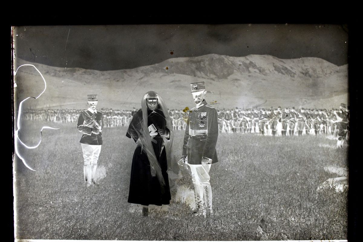 Descriere: Târgu Ocna, septembrie 1917. Regina Maria împreună cu generalul de corp de armată Alexandru Averescu înaintea unui moment festiv. Regina este în ținuta de soră de caritate; pe cap poartă un voal colorat, la gât are cel mai probabil, Crucea Regina Maria, clasa I (decorația în sine este în mâna reginei). În mâna dreaptă ține un toc de binoclu și un evantai, iar la cingătoare, în partea stângă, atârnă un stilet. Lângă ea - generalul de corp de armată Alexandru Averescu. Acesta poartă la gât Ordinul Mihai Viteazul clasa a II-a, iar pe piept ordinele Ordinul Mihai Viteazul clasa a III-a, Legiunea de Onoare franceză în grad de Ofițer, Ordinul Sfântul Gheorghe clasa a IV-a și placa Ordinului Coroana României în grad de Mare Ofițer. În spatele reginei, în partea dreaptă, se vede generalul de brigadă Nicolae Rujinschi, comandantul Diviziei 7, care poartă uniforma cu eghileți. În fundal se văd ostașii Armatei a 2-a română.