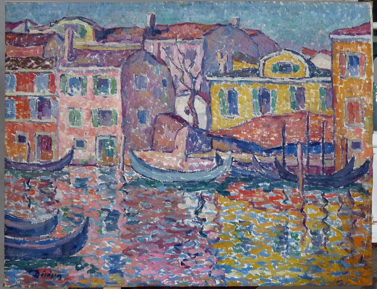Descriere: Peisajul venețian realizat de Nicolae Dărăscu redă în prim plan consistența apei pe care plutesc bărcile, în plan secundar clădirile care se oglindesc în reflexele apei. Formele sunt redate prin culoare, gama cromatică redusă la roșu, galben, albastru, verde, armonia cromatica făcându-se prin juxtapunere în maniera neoimpresionistă. Formele construite prin culoare, direct din tușa penelului oferă imaginii calități plastice accentuate. Semnat stânga jos cu roșu: Dărăscu.