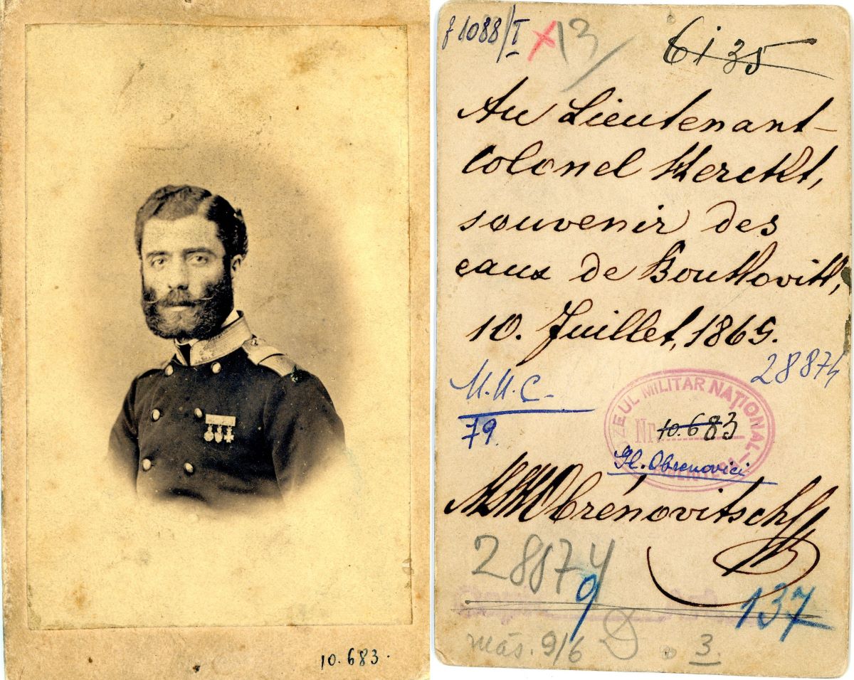 Descriere: Fotografie tip carte de vizite, portret, de studio, a prințului Mihailo Obrenovici al III-lea al Serbiei (n. 4/16 septembrie 1823, Kragujevac, Principatul Serbiei – d. 29 mai/10 iunie 1868, Topčider, lângă Belgrad). Prima domnie 1839-1842, minor, a doua domnie 1860-1868. A fost asasinat la 10 iunie 1868. Prințul Mihailo al III-lea Obrenovici este considerat unul din cei mai mari reformatori și mai luminați conducători ai Serbiei moderne. Fotografia a fost oferită locotenent-colonelului Heinrich Herckt, din armata română, considerat fondatorul artileriei române în timpul domnitorilor Alexandru Ioan Cuza și Carol I. El este, de asemenea, vărul viitorului rege Milan I (pe care l-a adoptat) (n. 1854 - d. 1901). Acesta era pe jumătate român, fiul Mariei Elena Catargi Obrenovici și al lui Miloș Jevrem (Efrem) Obrenovici, și nepot de frate al Prințului Miloș Obrenovici, fondatorul dinastiei. În imagine se distinge bustul Prințului Mihailo al III lea Obrenovici purtând uniforma armatei sârbe și trei decorații la piept, pe o baretă. Fotografia este pătată, iar imaginea este ușor estompată. Inscripțiile sunt plasate astfel: în colțul din dreapta, jos, sub fotografie, cu tuș negru, olograf, este scris numărul vechi de inventar „10683”; pe verso: cu tuș negru este scrisă olograf dedicația în limba franceză: „Au Lieutenant/-colonel Herckt,/ souvenir des eaux de Bouhovih(?)/ 10 Juillet 1865”. Mai jos, tot cu tuș negru este și semnătura olografă „M III Obrenovitsch”. Între dedicație și semnătură este aplicată o ștampilă ovală, cu tuș roșu, cu textul „Muzeul Militar Național/Bibliteca/ Nr 10683” (numărul completat cu tuș negru și tăiat cu o linie.) Tot pe verso sunt scrise toate celelalte numere vechi de inventar, precum și numărul actual și formatul, în colțul din stânga sus: „f 1088/I”.