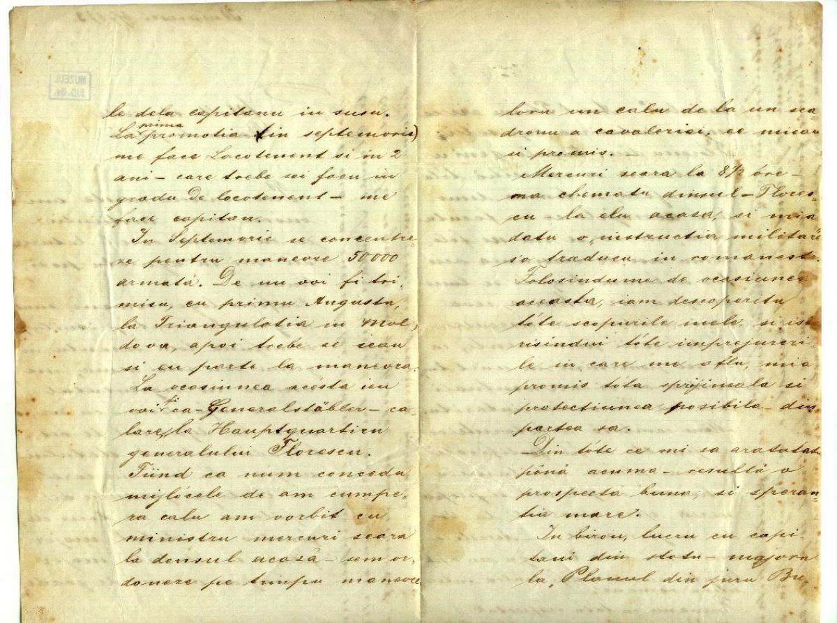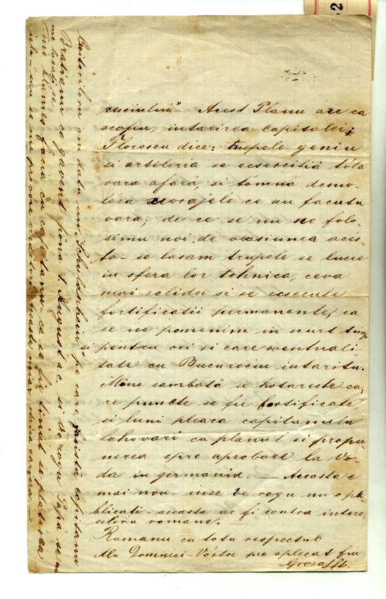 Descriere: Moise Groza (1844-1919), ofițer în armata română, îi comunică socrului său, Iacob Mureșianu (1812-1887) încadrarea în armata română pe lângă generalul Ioan Emanoil Florescu, în regimentul 3 Infanterie la depozitul de război. Informează că este deocamdată atașat Statului Major, urmând să fie primit în momentul în care va fi avansat la gradul de căpitan. Trimite informații despre proiectele de fortificație a Bucureștiului. În armata română a participat în Războiul de Independență unde a fost decorat pentru fapte de vitejie cu medalia „Virtutea militară”.