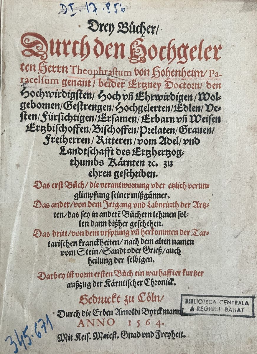 Description: Drey Bücher, Durch den Hochgelerten Herrn Theophrastum von Hohenheim, Paracelsum genant, beider Ertzney Doctorn, den Hochwirdigsten,... Ertzbischoffen, Bischoffen, Prelaten, Graven, Freiherren, Ritteren, vom Adel, und Landtschafft des Ertzhertzogthumbs Kärnten & c. zu ehren geschriben. Das erst Buch, die verantwortung uber etzlich verunglimpfung seiner miszgünner. Das ander, von dem Irrgang und Labyrinth der Artzten, das sye in anderen Büchern lehrnen sollen dann biszher geschehen. Das dritt, von dem ursprung und herkommen der Tartarischen kranckheiten, nach dem alten namen vom Stein, Sandt oder Griesz, auch heilung der selbigen. Darbey ist vorm ersten Buch ein warhaffter kurtzer auszug der Kärntischer (!) Chronick. Gedruckt zu Cöln Durch die Erben Arnoldi Byrckmanni. Anno 1564. Mit Keis. Maiest. Gnad und Freyheit.