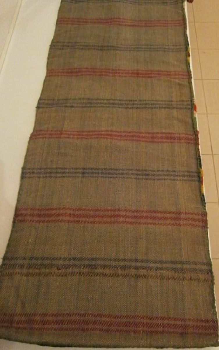 Bumbac, lână, cânepă; fața: urzeală din bumbac, băteală din lână; dosul: cânepă. Fața: țesută în război în două ițe, motive alese cu mâna în tehnica Karamani, iar dosul tot țesut în război în patru ițe.