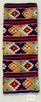 Description: Piesă de formă dreptunghiulară compusă din față și dos, încheiate cu mâna în punct de feston. Fața: câmp bleumarin cu vârste roșii care încadrează cinci benzi de motive stelare alese. Dosul: prezintă grupe de câte trei vârste dispuse la intervale egale. Cromatică: fața: bleumarin, roșu, alb, vișiniu, portocaliu, verde; dosul: urzit cânepă în culoarea naturală, bătut cânepă vopsită albastru și vârste albastru și roșu.