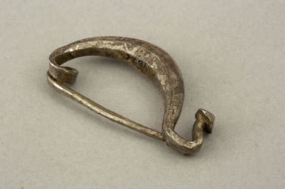 Description: Fibulă de tip tracic cu resort unilateral, format dintr-o spiră completă. Arcul îngroșat și fațetat (opt fețe) continuă cu piciorul în forma literei S, care se termină cu un buton piramidal, decorat cu linii incizate dispuse sub forma unui romb dublu și vârf aplatizat.