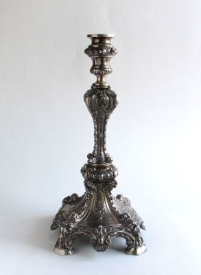 Description: Talpă mare, cu patru picioare și muchii puternic profilate; fusul înalt, cu nod ovoidal, sprijină cupa sfeșnicului.