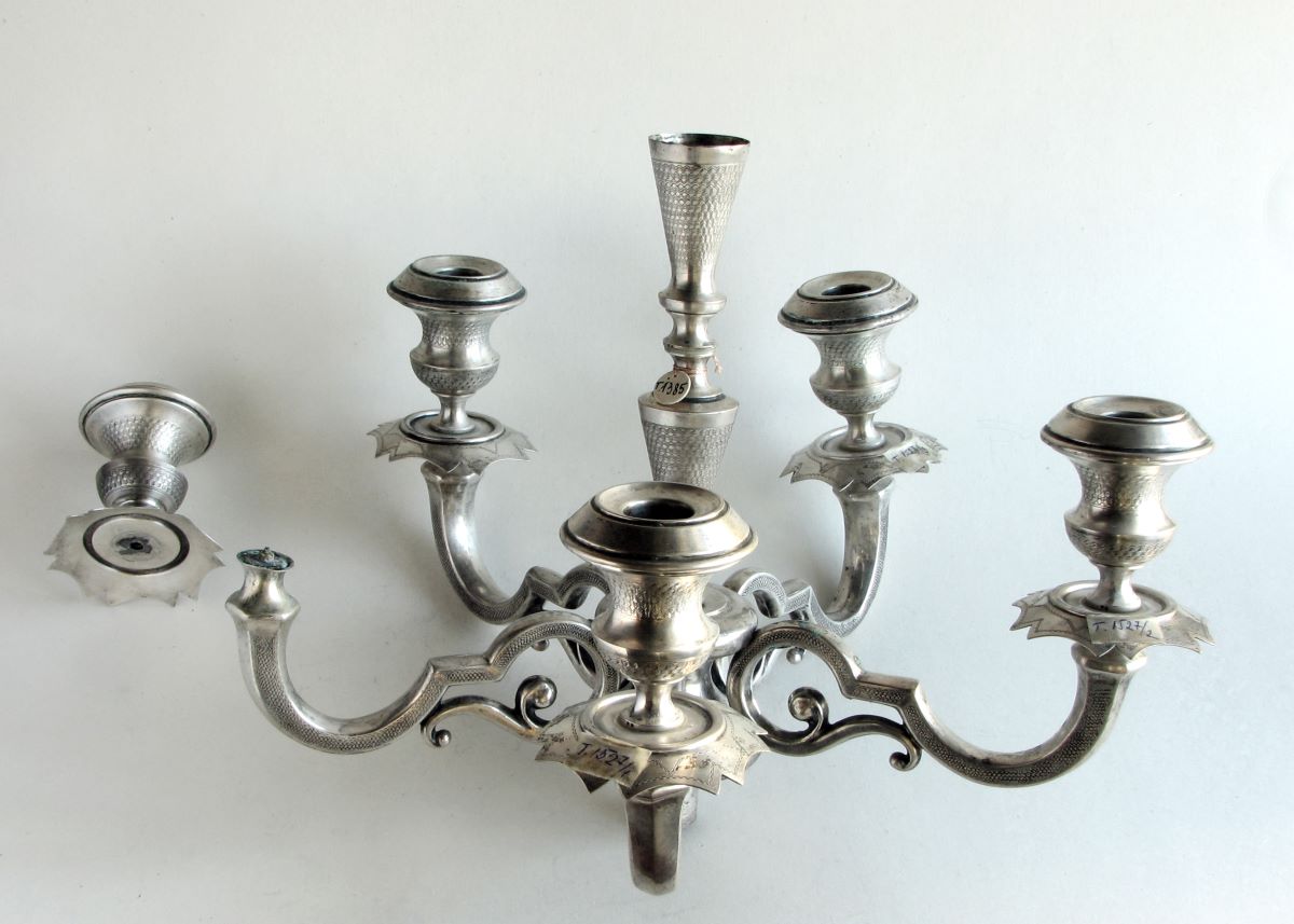 Description: Candelabru cu 5 brațe, 5 cupe pentru lumânări - prevăzute fiecare cu câte o farfurioară; formă și decor specifice stilului Baroc.