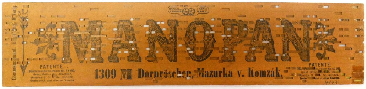 Description: Cartelă perforată, sub forma unei benzi circulare, confecționată din carton pânzat și utilizată pentru redarea sunetului la organeta denumită Manopan, un automat muzical mecanic. Cartela conține programarea, cu ajutorul perforațiilor, a melodiei de la mazurka cu titlul „Dornröschen”, compozitor: Komzák. Cartela conține înregistrarea, prin intermediul perforațiilor, a 24 de note muzicale, fiecare perforație reprezintând o notă muzicală; lungimea unei perforații depinde de durata notei muzicale redate. Pe bandă este tipărit: titlul melodiei, compozitorul, poziția titlului din catalog (1309 M), nr. patentului înregistrat în Germania (42203), Marea Britanie (1847/1887) și în Statele Unite ale Americii (307322). Pe cartelă este indicat prin intermediul unei săgeți locul de poziționare a acesteia în aparat, cu începutul melodiei. Folosirea cartelei perforate la automatele muzicale a reprezentat o etapă importantă în evoluția mijloacelor de înregistrare-redare a sunetului.