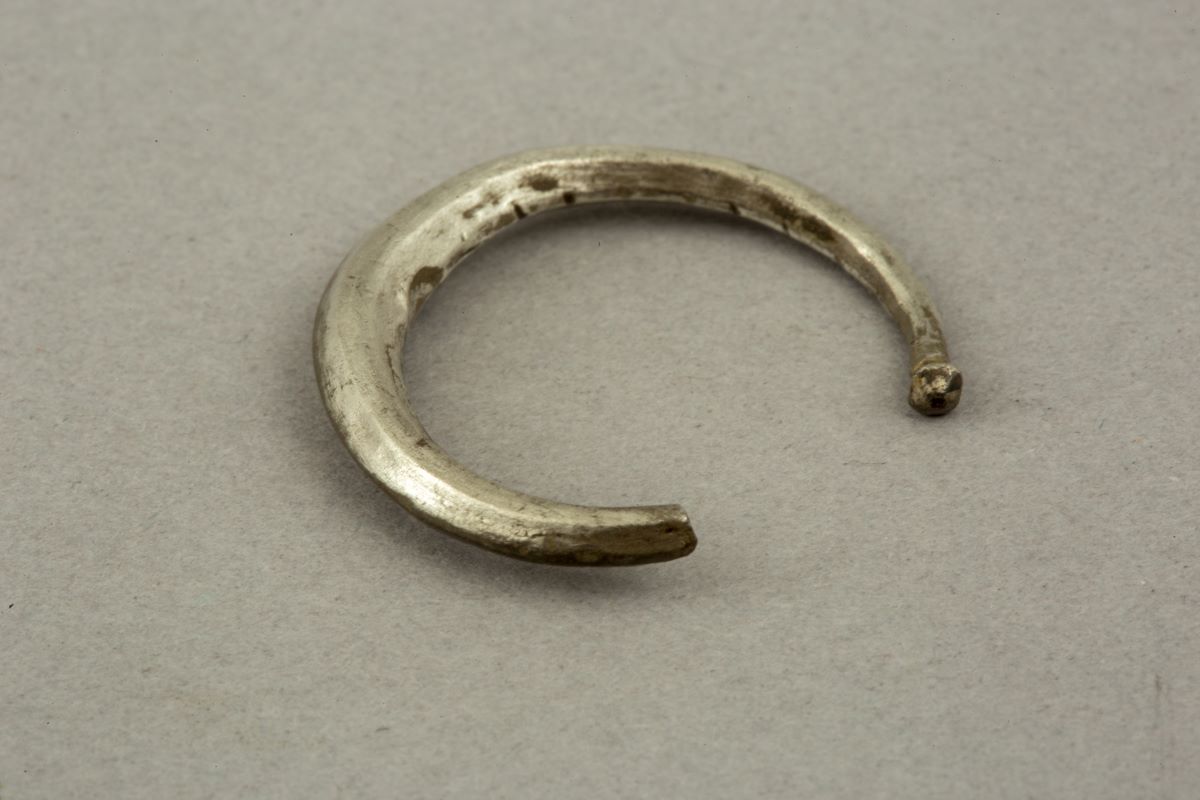 Description: Verigă din sârmă de argint, ușor aplatizată și fațetată, care se subțiază spre terminații. Una dintre terminații este ruptă, iar cealaltă este decorată cu un buton de formă conică.