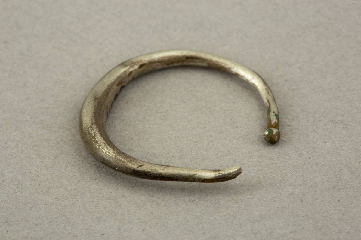 Description: Verigă din sârmă de argint, circulară în secțiune, ușor aplatizată și care se subțiază spre terminații. Una dintre terminații este ruptă, iar cealaltă este decorată cu un buton de formă conică.