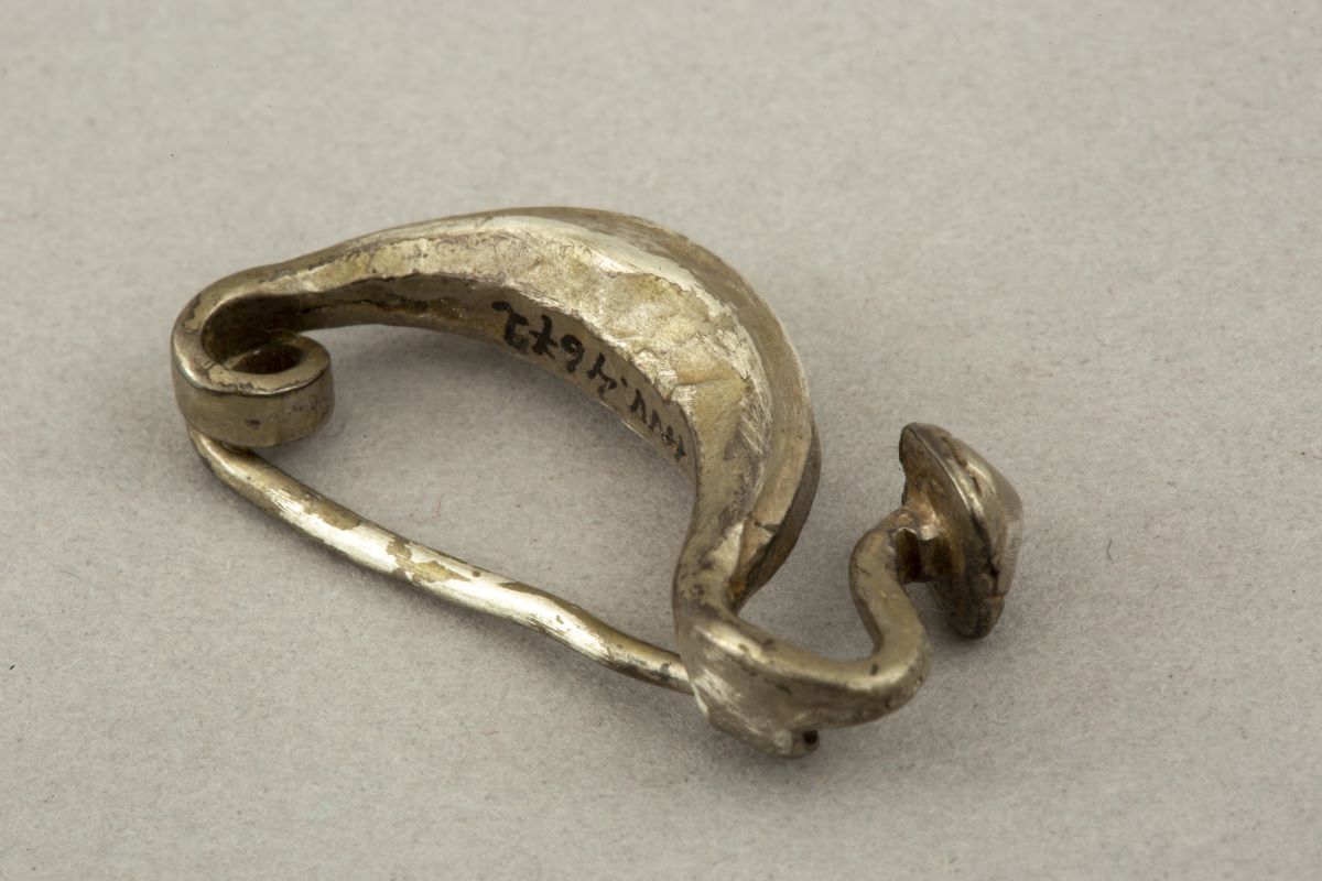 Description: Fibulă de tip tracic cu resort unilateral, format dintr-o spiră completă. Arcul îngroșat și decorat cu trei caneluri continuă cu piciorul în forma literei S, care se termină cu un buton piramidal, decorat cu linii incizate dispuse în forma unui romb.