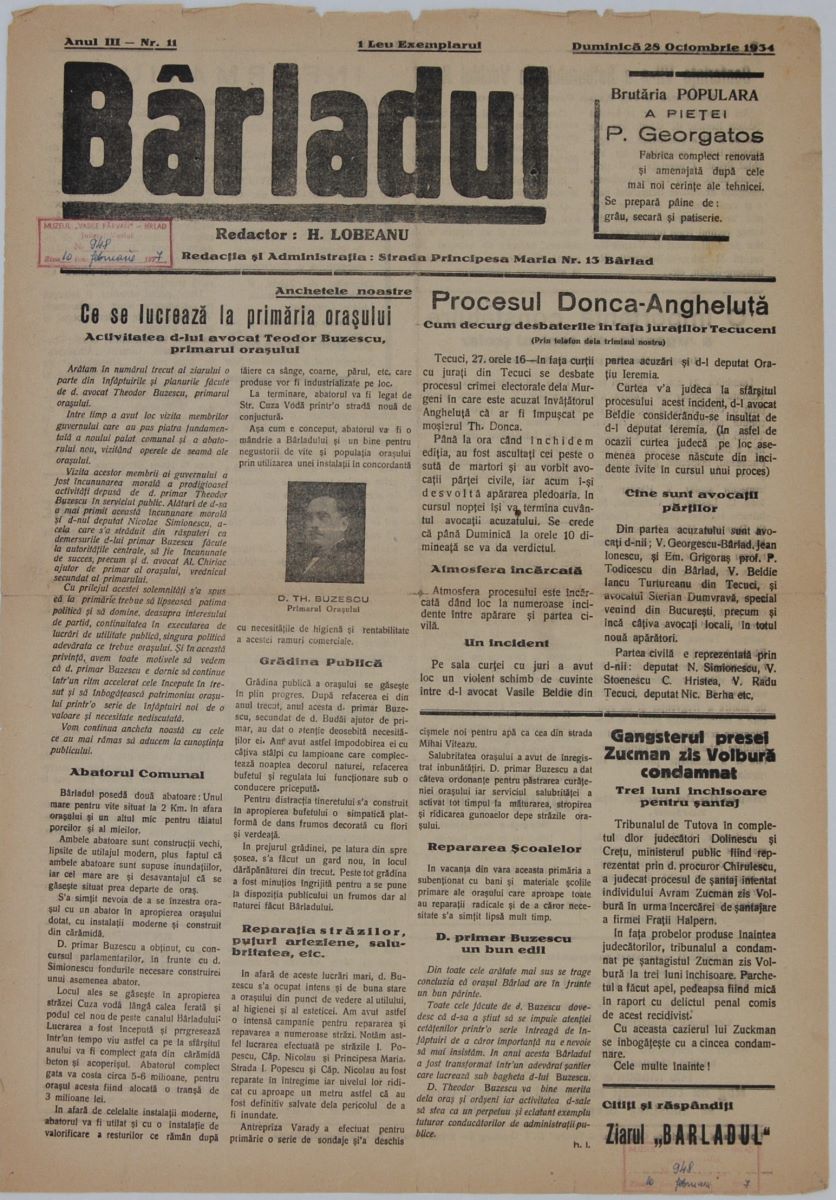 Description: Acest ziar - Anul III Nr. 11 din 28 Octombrie 1934 - cu apariție săptămânală, a fost tipărit la Tipografia și Legătoria de Cărți "Tiparul Tutovei" (situată pe Strada Regală, vis-a-vis de Casa Națională „Stroe Belloescu”), sub Redacția și Administrația de pe Strada Principesa Maria No. 13. Redactorul acestui ziar se numea H. Lobeanu. Ziarul de față are două pagini și conține articole referitoare la viața socială a orașului. Pe a doua pagină, apar reclame la magazinul de coloniale „Julius Sechter”, magazinul „Bon Marche”, depozitele de cherestea „Charles Kahane” și „M. Kamiel & H. Grunberg” etc. Exemplarul face parte din colecția ziarul „Bârladul”, de la muzeul „V. Pârvan”, Bârlad.