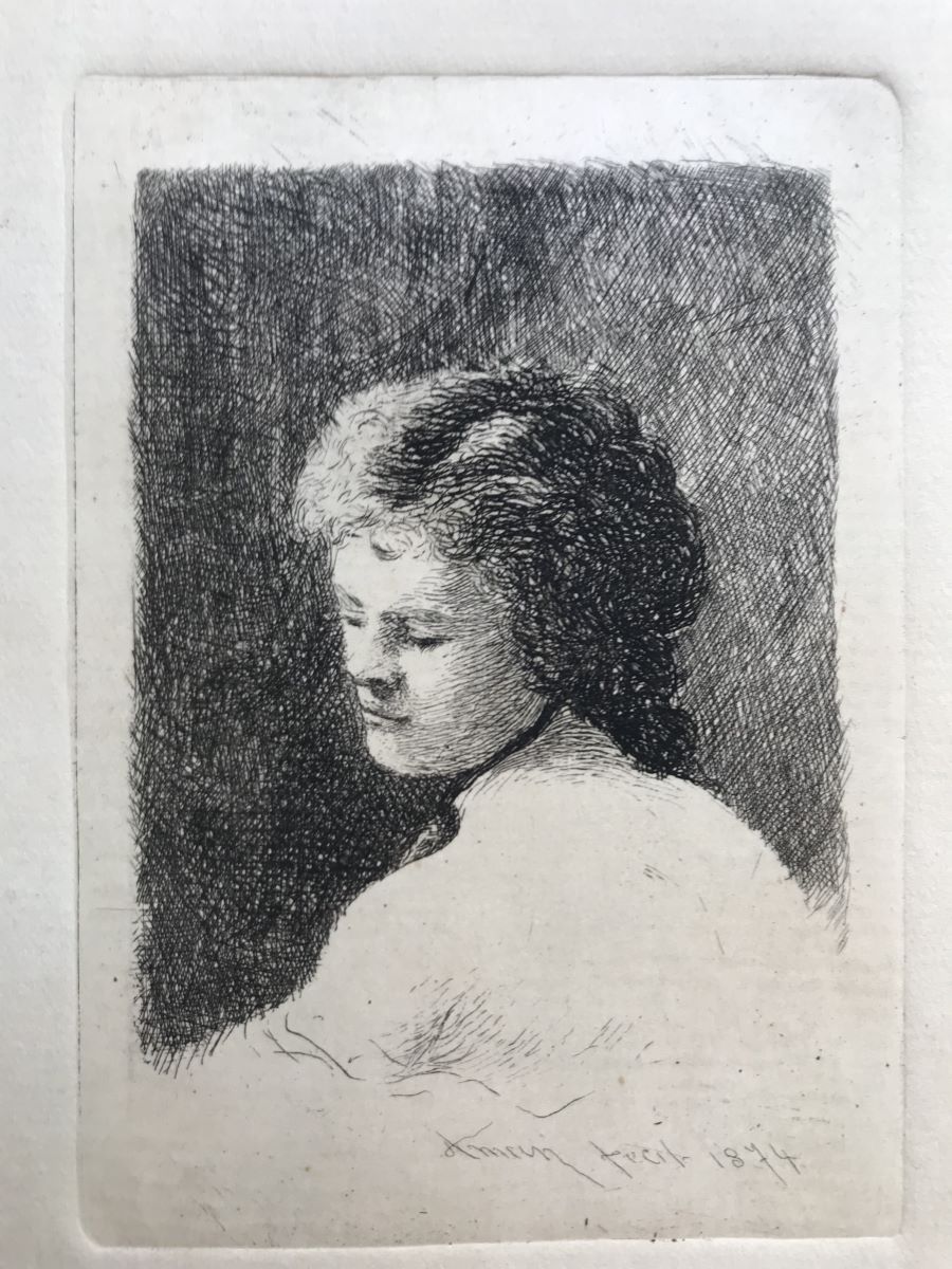 Description: Portret de femeie (din familia Ney d'Elschingen) privită din trei sferturi spre stânga; poartă la gât un elegant colier de catifea neagră; umerii sunt nelucrați. Aman aplică principiul negetivului fotografic, capul puternic luminat profilându-se evanescent pe fundalul intunecat. Desen fin și delicat, cu hașuri asemănătoare unui „fân”, specifice gravurii impresioniste. Placa de aramă în colecția Muzeului Theodor Aman, inv. 716.