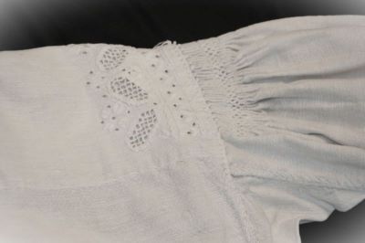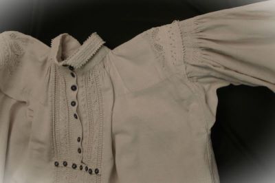 Description: Cămașa este confecționată din 2 lați de pânză, este de tip poncho, netăiată la umăr (dublați pe interior). Deschizătura din față este adâncă și coincide cu locul de îmbinare a laților de pânză; gulerul înalt, mâneca este amplă, cu pânza des încrețită pe umăr și la manșetă, care este lată. Câmpii ornamentali: registre verticale - piept, umeri și registre transversale: piept, guler, manșete. Pe piept, are un câmp ornamnetal mai lung decât în mod obișnuit, ce oferă locul de a aplica două punți orizontale ornamnetate cu nasturi. Tehnica de ornamentare: broderie plină – „miezește” (piept), „ruda miezească” (piept, umăr, guler, manșetă), „bătucitura” (umăr, manșetă, piept), broderie spartă – „ciur netăiat” (umăr, manșetă, piept), „ochi întorși” (umăr); cusătură tip fagure (piept, mâneci); pliuri verticale; aplicații de pânză în registre orizontale. Ornamente: geometrice: colțișori mai mari (piept) și mărunți (piept, guler, manșete), fitomorfe: „frunze” (umăr); aplicații de nasturi în două rânduri orizontale și într-un șir vertical până sus, inclusiv la guler. Cromatică: fond monocrom alb, albastru închis (nasturi)