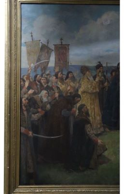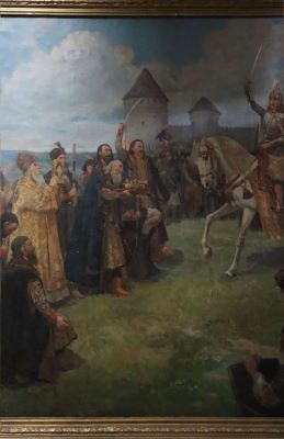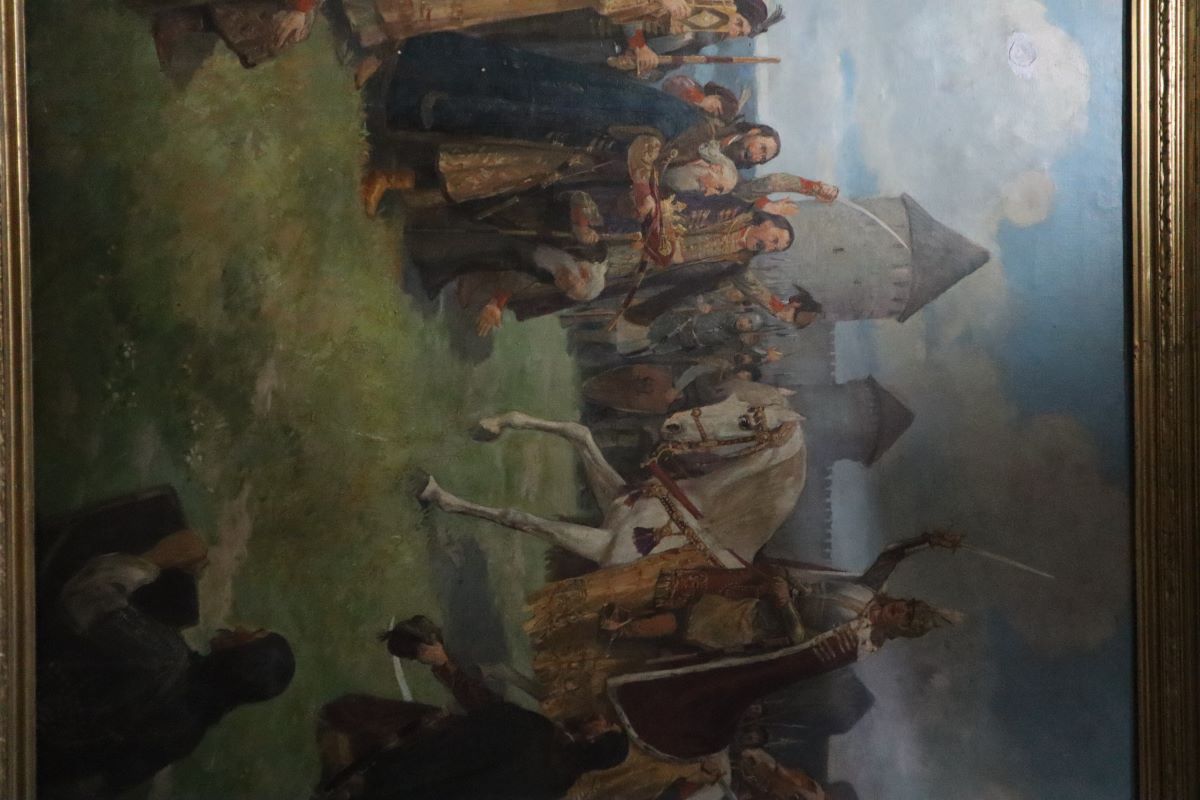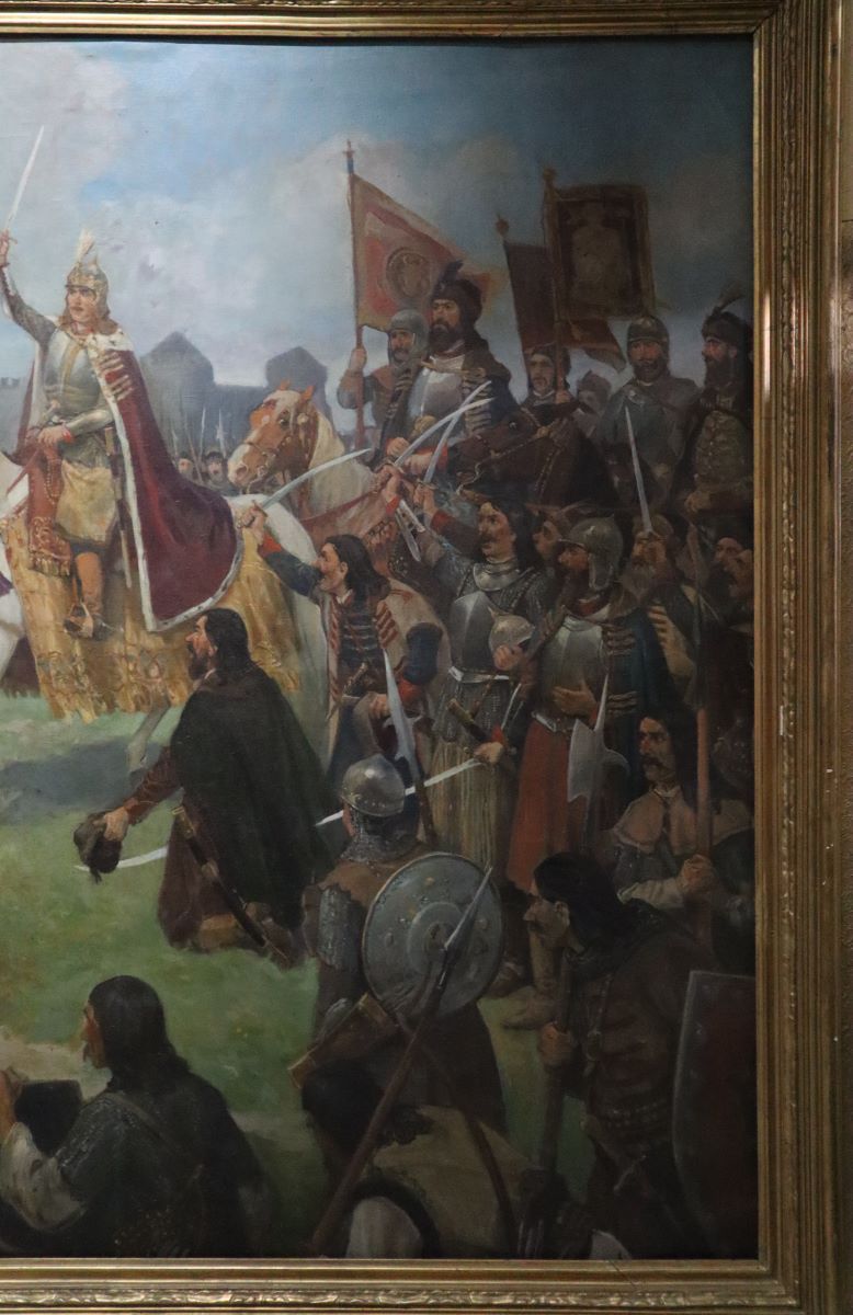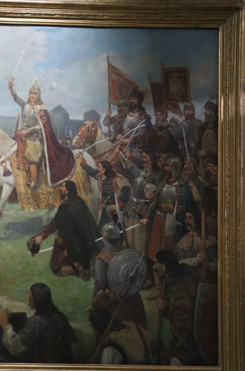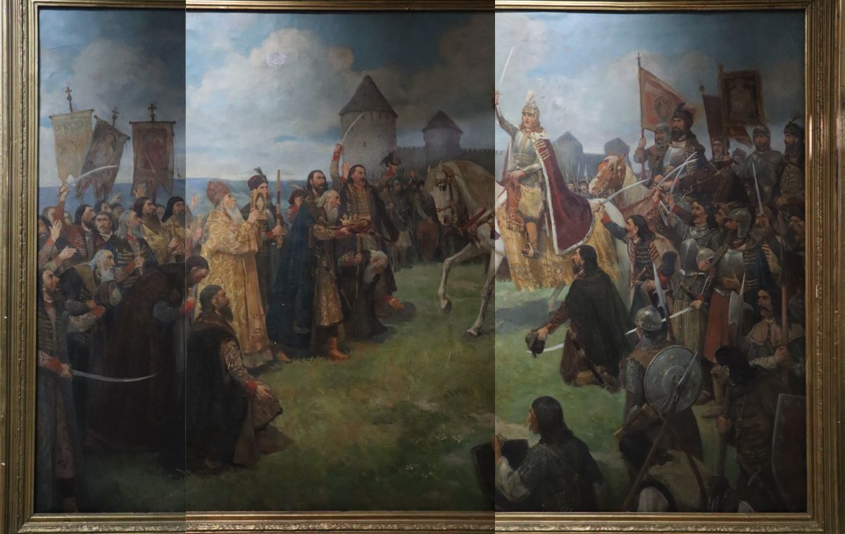 Description: Opera descrie solemnitatea alegerii ca domn al Moldovei pe Ștefan cel Mare. În primul plan în partea stângă este ilustrat grupul de boieri în frunte cu Ștefan cel Mare, iar în partea dreaptă grupul format din cler în frunte cu mitropolitul Moldovei care înmânează lui Ștefan însemnele domnești.