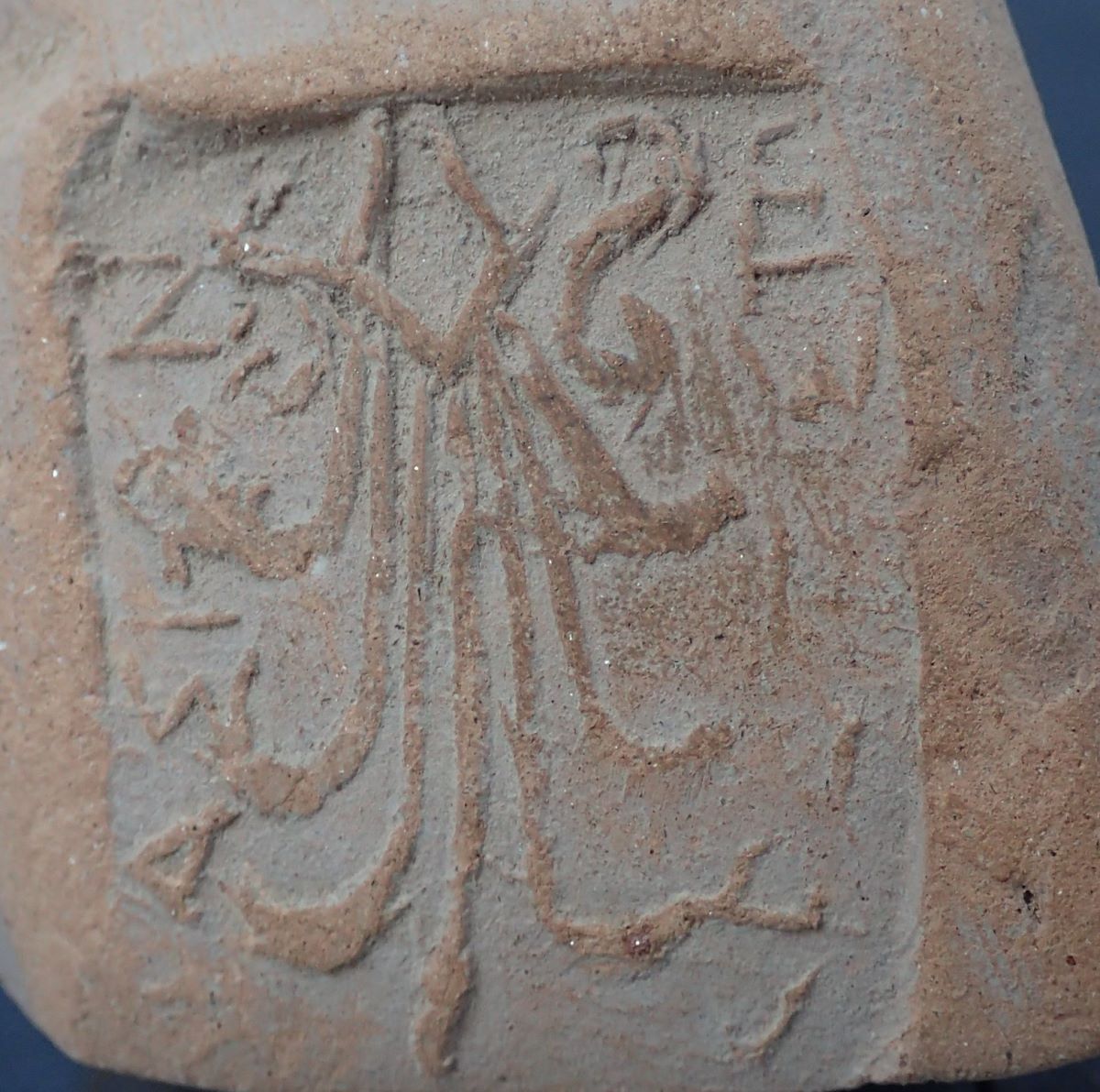 Description: Ștampilă amforică, cu origine Thasos, cu legenda pe două rânduri între care este intercalată o palmetă de tip IV: Θασίων / Κρατιστών(αξ) - numele magistratului (310-295 a.Chr.).