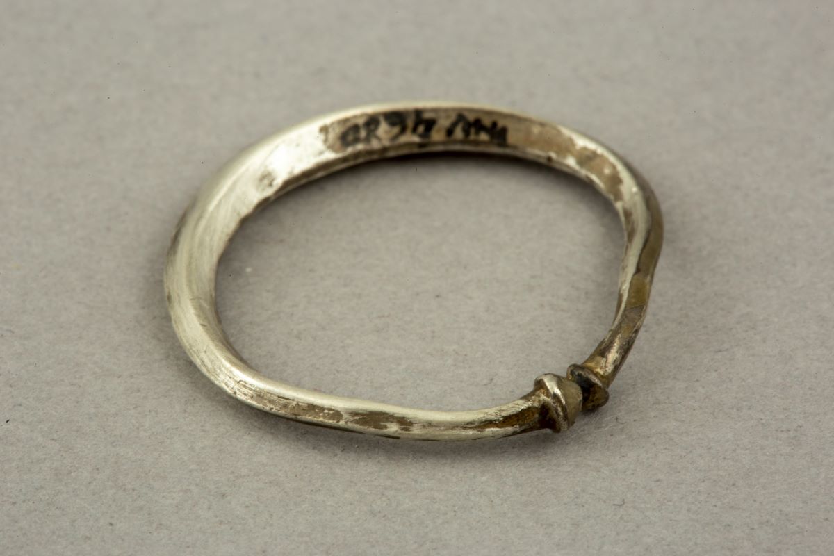 Description: Verigă din sârmă de argint, rectangulară în secțiune, care se subțiază spre terminații. Terminațiile decorate cu butoni mici de formă conică se ating. Veriga este deformată.