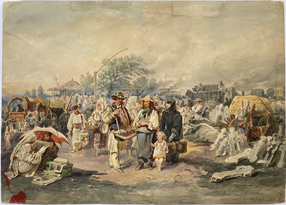 Description: După vizita Principelui Carol la Istanbul din 1866, contele Amedeo Preziosi (1816-1882) este solicitat să vină în Țările Române să ilustreze costume și vederi inedite. El călătorește cu Domnitorul în două rânduri în Principate, la 1868 și 1869 și lucrează alături de Carol Pop de Szathmári compoziții similare, multe păstrate în fosta colecție regală. Lucrare realizată cu pantograful și semnată de Szathmári. Vedere panoramică asupra Tărgului Moșilor. În prim-plan în stânga, așezati pe jos un călugăr negociază icoane multiplicate cu o țărancă, la centru un negustor de bomboane își oferă marfa unei țărănci cu copil și unei călugărițe, în dreapta o femeie cu copil păzește de cruci din piatră. Acuarela lui Szathmári este similară cu cea a lui Preziosi cu diferențe ușoare în aplicarea petelor de culorare, mai rapide mai putin minuțioase decât a artistului maltez.
