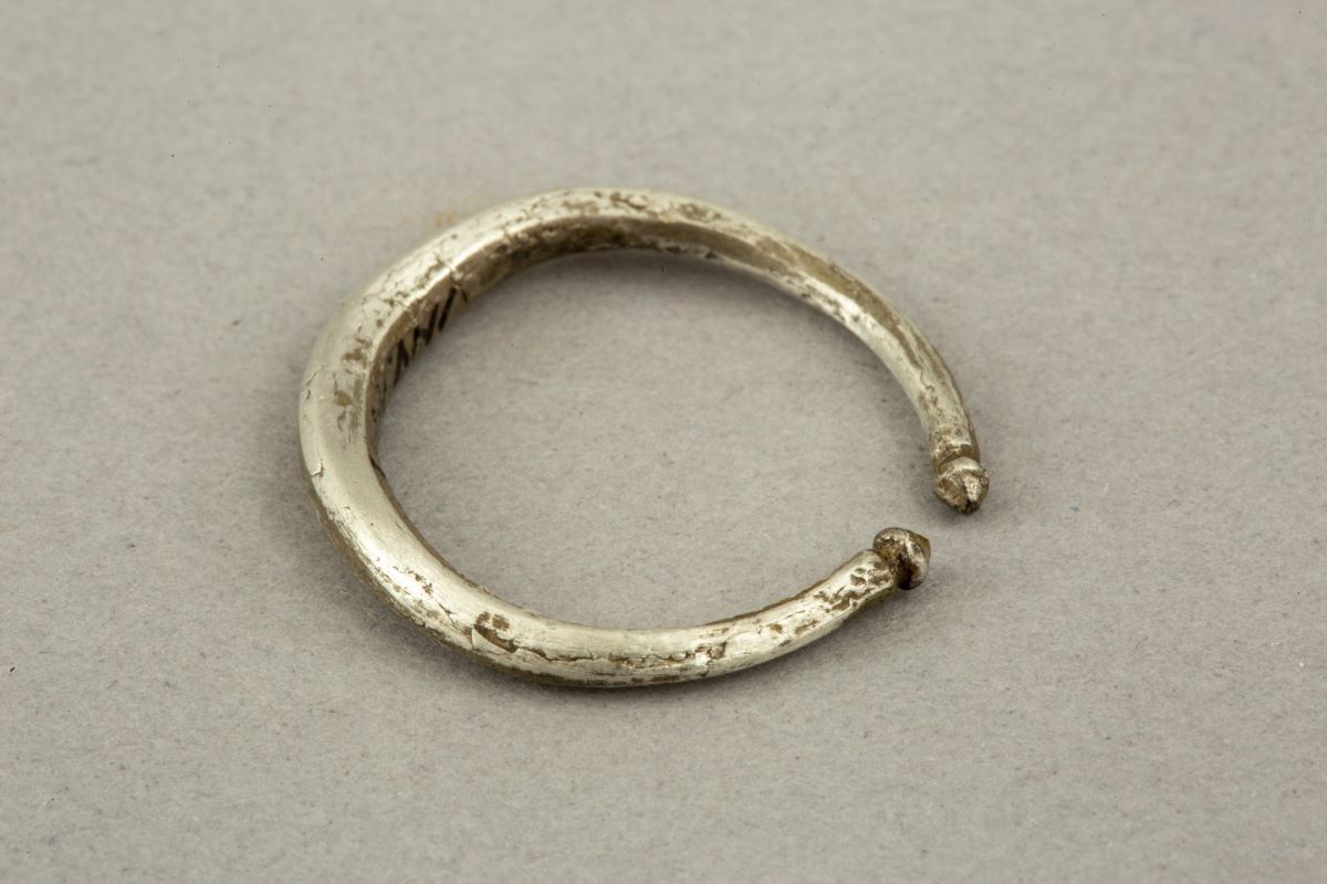 Description: Verigă din sârmă de argint, ușor aplatizată și fațetată, care se subțiază spre terminații. Terminațiile decorate cu câte un buton de formă conică sunt ușor distanțate.