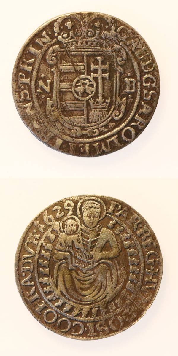 Legendă dispusă circular pe margine între două cercuri perlate. Central Fecioara așezată, ținându-l pe Christ în brațe, totul înconjurat de raze. Christ ține un sceptru în mână.