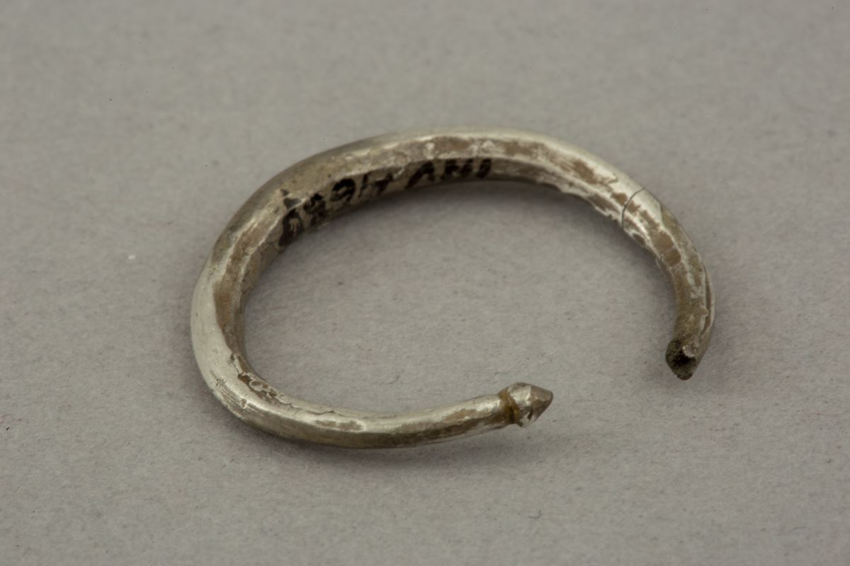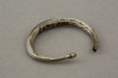 Description: Verigă din sârmă de argint, ușor aplatizată și fațetată, care se subțiază spre terminații. Una dintre terminații este ruptă, iar cealaltă este decorată cu un buton de formă conică. Veriga este ușor deformată.