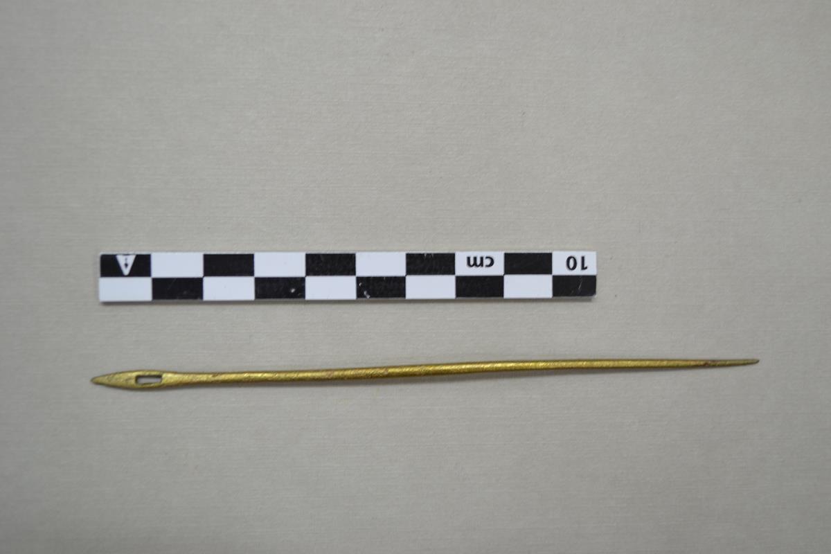 Description: Ac de cusut din bronz, cu urechea rectangulară, capătul plat și terminația în unghi ascuțit.
