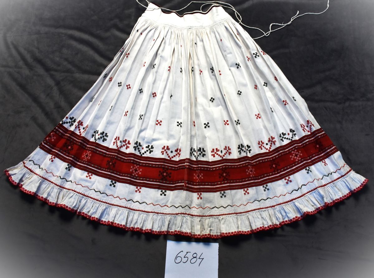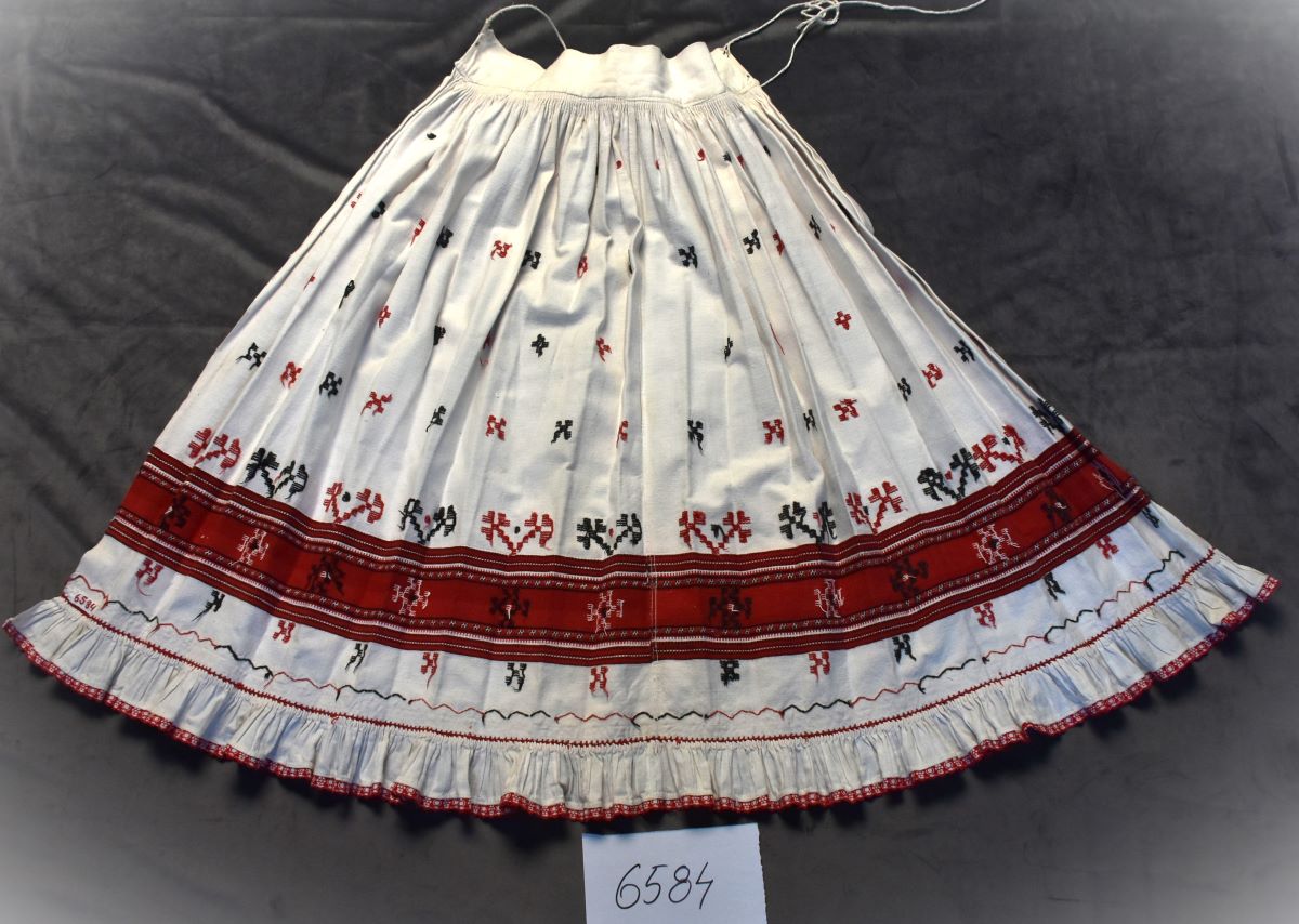 Description: Zadie - șorț cu formă morfologică trapezoidală. Piesa fiind confecționată din 2 lați de pânză ("învăluită" din misir și bumbac) este mărunt încrețită și se prinde în talie, de bartă. Piesa este încheiată la mașina de cusut; este tivită. Tehnici de ornamentare: aleasătură în război (cu suveica), aplicație de pânză încrețită; aplicație de panglică brodată industrial; cheiță (pentru atașarea volanului de pânză), tighel. Câmpii ornamentali: pe toată suprafața. Motive ornamentale: motive geometrice – colți (registru inferior), motive simbolice ( prescura - pe toată suprafața), fitomorfe – crengi, abstracte – vrâste și skeumorf - roata cea mare și dinți (registru inferior). Cromatică: alb, roșu, negru