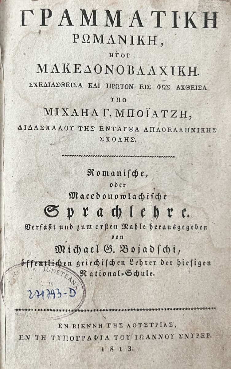 Description: Grammatiche Romaniche, efi Machedonovlahiche shediasthisa che proton is fos ahthisa hipo Mihael G. Voiatse, didascalou tes entavtha aploelleniches sholes. Romanische, oder Macedonowlachische Sprachlehre. Verfasst und zum ersten Mahle herausgegeben von Michael G. Bojadschi, öffentlichen griechischen Lehrer der hiesigen National-Schule. En Vienne tes Austrias, en te tipografia tu Ioannu Snirer, 1813.
