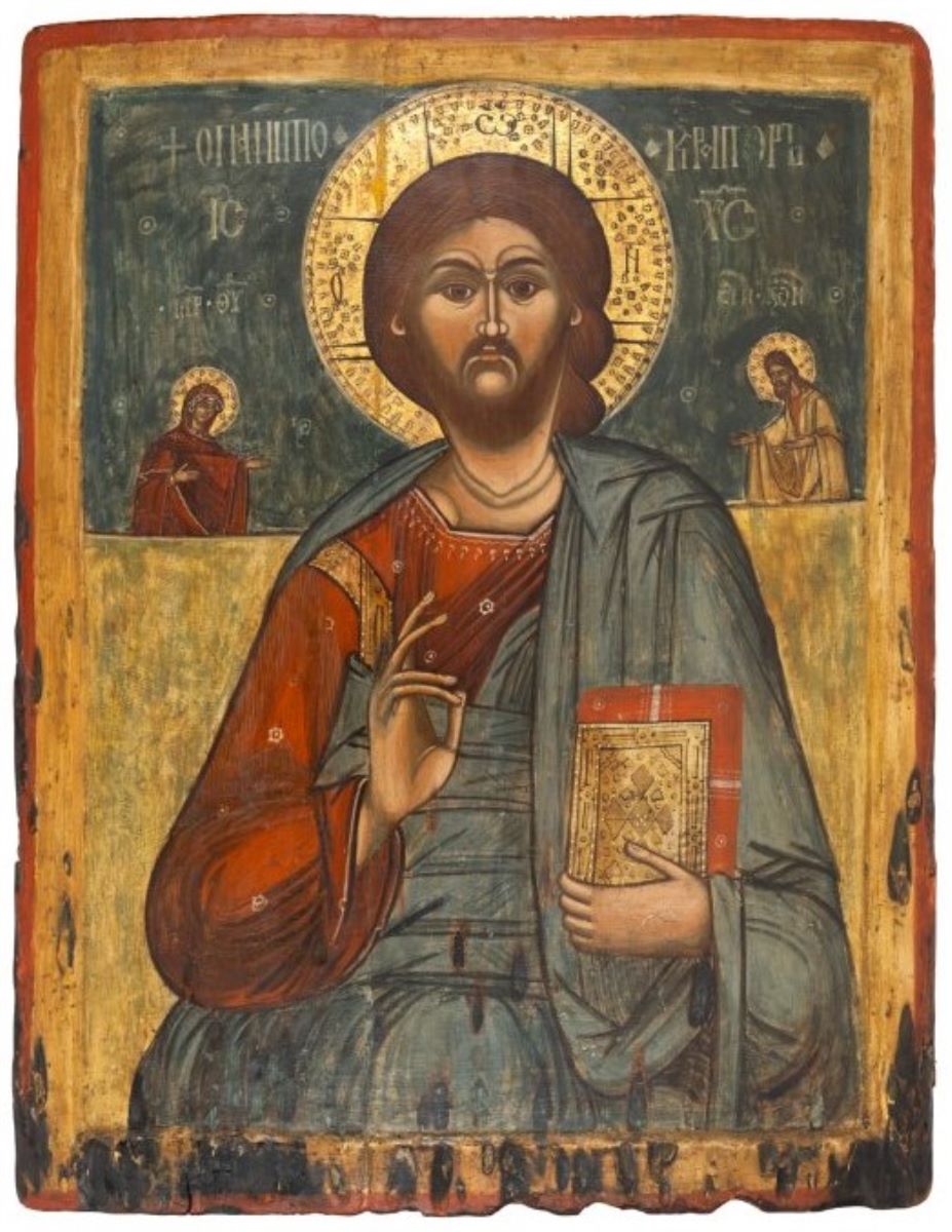 Description: În nava adâncită a icoanei, pe un fond pictat cu verde-albastru în partea de sus și verde-oliv în partea de jos, este redată figura statuară a Iisus Hristos, prezentat frontal. Este reprezentat până mai jos de brâu, înveșmântat cu chiton roșu și himation albastru; binecuvântează cu dreapta, iar cu stânga ține Evanghelia închisă, ferecată în argint aurit, încrustată cu pietre prețioase și perle. De remarcat, deasupra umerilor, de mici dimensiuni, sunt reprezentați Maica Domnului și Sfântul Ioan Botezătorul, în atitudine de rugăciune, în calitate de intercesori. Chipul lui Iisus se înscrie în stilul picturii brâncovenești: față ovală, ochii mari și alungiți spre tâmple, cearcăne sub ochi, sprâncene arcuite, nas drept, gură mică și roșie. Părul, barba și mustața sunt pictate cu brun, iar șuvițele de păr sunt trasate cu brun închis. Modelajul chipului este realizat printr-o gamă succesivă de ocruri, iar umbrele sunt redate cu roșu și verde-oliv. Aureola crucigeră din jurul capului este decorată prin incizie cu rotiță. Veșmintele sunt tratate conform tradiției în cute unghiulare, redate cu nuanțe mai închise ale aceleiași culori. Icoana este pereche cu icoana împărătească Maica Domnului cu Pruncul. Panou din lemn de tei, întărit la spate cu două traverse semiîngropate, ramă lată degroșată, tempera pe lemn, foiță de aur (parțial păstrată).