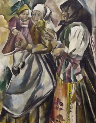 Description: Compoziție cu două femei figurate în picioare. Cea din stânga, răsucită spre stânga, ține în brațe o fetiță costumată în haine de oraș după moda timpului (cu beretă cu fundă, rochiță cu mâneci bufante, ciorapi albi și pantofiori negri). Copilul este orientat spre dreapta, unde o a doua femeie, privită din profil spre stânga, îi oferă o jucărie. Perspectiva proximă face ca cele trei personaje să dobândească o pregnantă monumentalitate.