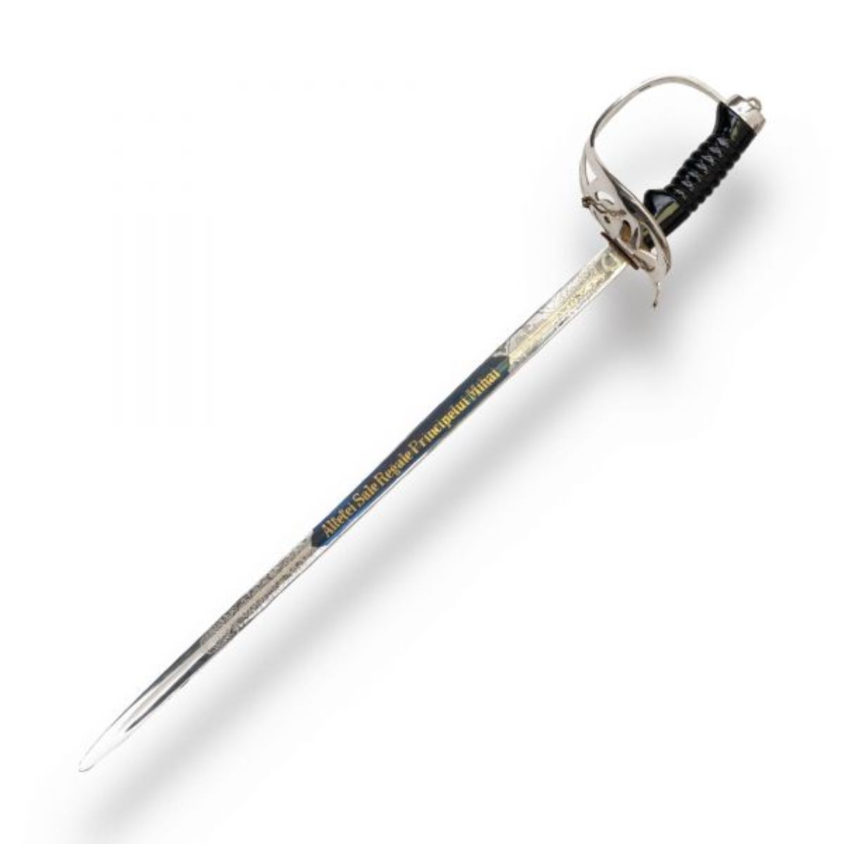 Description: Sabie de cavalerie, miniatură. Sabia are garda după modelul săbiilor de cavalerie, trupă, md. 1906, confecționată din tablă de oțel nichelată, traforată pentru a realiza trei ramuri exterioare (unite printr-un ornament circular) și o ramură interioară. Ea are la partea inferioară o scoică și o ramură posterioară mai mică. Mânerul este din material plastic, prevăzut cu striații pentru a împiedica alunecarea mâinii, având la partea inferioară o ieșitură care servea la sprijinul degetului arătător. La partea superioară a mânerului se găsește o lentilă metalică, care fixează tot ansamblul printr-o prindere cu capul semirotund. Prin inscripțiile de pe lamă, se poate particulariza apartenența acesteia ca fiind sabia dăruită principelui Mihai, la data respectivă în vârstă de 5 ani și 3 luni, din partea ofițerilor din Regimentul 4 Roșiori „Regina Maria”. Acest eveniment a avut loc la data de 9 ianuarie 1927, cu prilejul aniversării a 30 de ani de la preluarea comenzii onorifice a unității de către regina Maria, în anul 1897. Cu acest prilej, ofițerii regimentului au oferit diverse daruri familiei regale a României, inclusiv „o sabie pentru principele Mihai” (conf. Serbarea de la Regimentul 4 Roșiori„ Regina Maria”, ziarul „Dimineațaˮ, nr. 7226, din 12 ianuarie 1927, p. 5). Lama este confecționată după modelul săbiilor de ofițer, md. 1909, este dreaptă, cu tăiș, contratăiș și șanț median. Pe ambele fețe lama este gravată cu ornamente florale, însemnele naționale, regale și cu devize care atestă persoana, cadrul și momentul în care sabia a fost prezentată. Pe fața exterioară a lamei, sub gardă, este gravat cifrul regelui Ferdinand I și textul: „Alteței Sale Regale Principelui Mihai” scris cu litere aurii pe un fond albastru. Pe fața interioară a lamei, sub gardă este gravată stema regală și, în continuare, textul: „Jaruarie (Sic!) 1927. Ofițerii Regimentului 4 Roșiori ˮ, scris cu litere aurii pe un fond albastru. Numele producătorului este figurat la partea superioară a lamei, imediat sub garda. Pe fața exterioară este gravat numele producătorului german: CARL EIOCKHORN / SOLINGEN, iar pe fața interioară, tot sub gardă, este gravată sigla fabricantului, o veveriță în interiorul unui oval. Teaca este confecționată după modelul săbiilor de ofițer, md. 1909, este dreaptă, din oțel brunat și are o brățară cu două inele opuse, precum și o potcoavă asimetrică la partea inferioară. Sabia este prevăzută cu un dragon din fir auriu, legat de unul din brațele gărzii. Dragonul are cureaua de prindere din galon de fir auriu, cu țesătura în zig-zag, are la capăt un ciucure din fir auriu și este prevăzut cu un inel tot din fir auriu, pentru a fi ajustat la încheietura mâinii atunci când sabia este scoasă din teacă. Sabia este prevăzută și cu o port-sabie de ofițer, md. 1912, confecționată din două atârnători paralele, confecționate din galon lat, auriu, având o țesătură în formă de frunze de stejar, paspoalată cu stofă bleu, culoarea distinctivă a Regimentului 4 Roșiori „Regina Maria”. La partea superioară atârnătorile sunt prinse de o carabinieră aplatizată și inelul pentru curea, care se fixa la cureaua port-sabie, purtată pe sub tunică, iar la partea inferioară, extremitățile atârnătorilor sunt ascuțite și au câte o cataramă ovală din alamă, care susțin, pe interior, carabinierele de oțel care se fixează la inelele tecii. În urma examinării obiectului se constată că acesta respectă întru totul caracteristicile și detaliile constructive ale săbiilor utilizate de ofițerii armatei române în primele decenii ale secolului al XX-lea, încadrându-se în prevederile regulamentare privind armamentul alb din epoca respectivă. Prin inscripțiile de pe lamă, se poate particulariza apartenența acesteia ca fiind sabia dăruită principelui Mihai, la data respectivă în vârstă de 5 ani și 3 luni, din partea ofițerilor din Regimentul 4 Roșiori „Regina Maria”. Acest eveniment a avut loc la data de 9 ianuarie 1927, cu prilejul aniversării a 30 de ani de la preluarea comenzii onorifice a unității de către regina Maria, în anul 1897. Cu acest prilej, ofițerii regimentului au oferit diverse daruri familiei regale a României, inclusiv „o sabie pentru principele Mihai” (conf. Serbarea de la Regimentul 4 Roșiori„ Regina Maria”, ziarul „Dimineațaˮ, nr. 7226, din 12 ianuarie 1927, p. 5).
