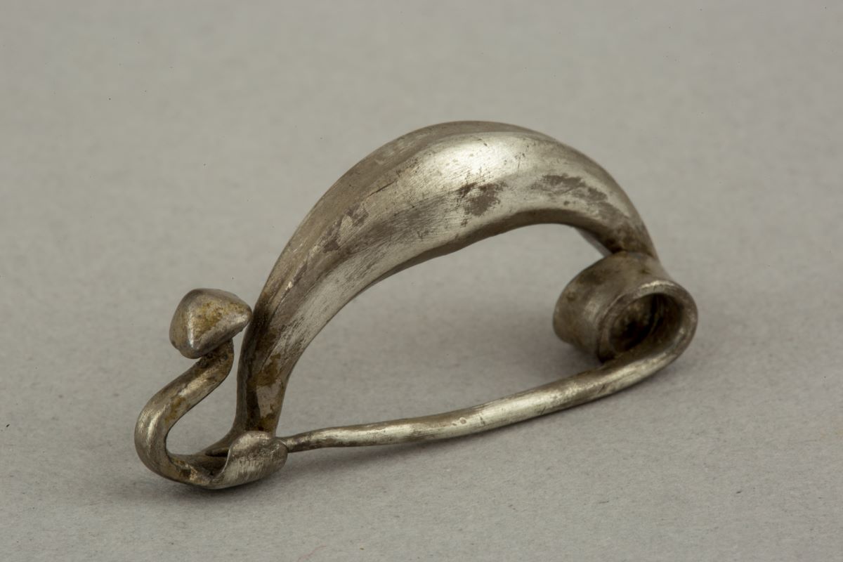 Description: Fibulă de tip tracic cu resort unilateral, format dintr-o spiră completă. Arcul îngroșat și fațetat (opt fețe) continuă cu piciorul în forma literei S, care se termină cu un buton piramidal.
