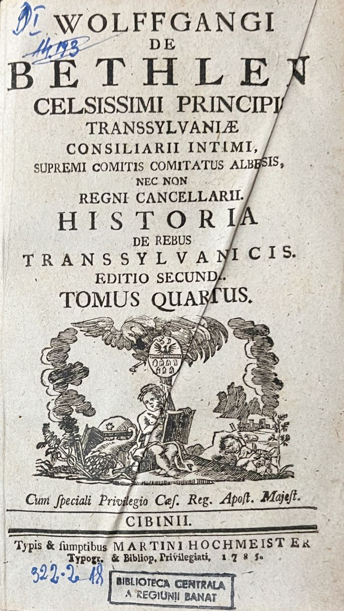 Description: Wolfgangi de Bethlen celsissimi principis Transsylvaniae consiliarii intimi, supremi comitis comitatus Albensis, nec non regni cancellarii. Historia de rebus Transsylvanicis. Editio secunda. Tomus quartus. Cum speciali privilegio Caes. Reg. Apost. Majest. Cibinii. Typis et sumptibus Martini Hochmeister. Typogr. & Bibliop. Privilegiati, 1785