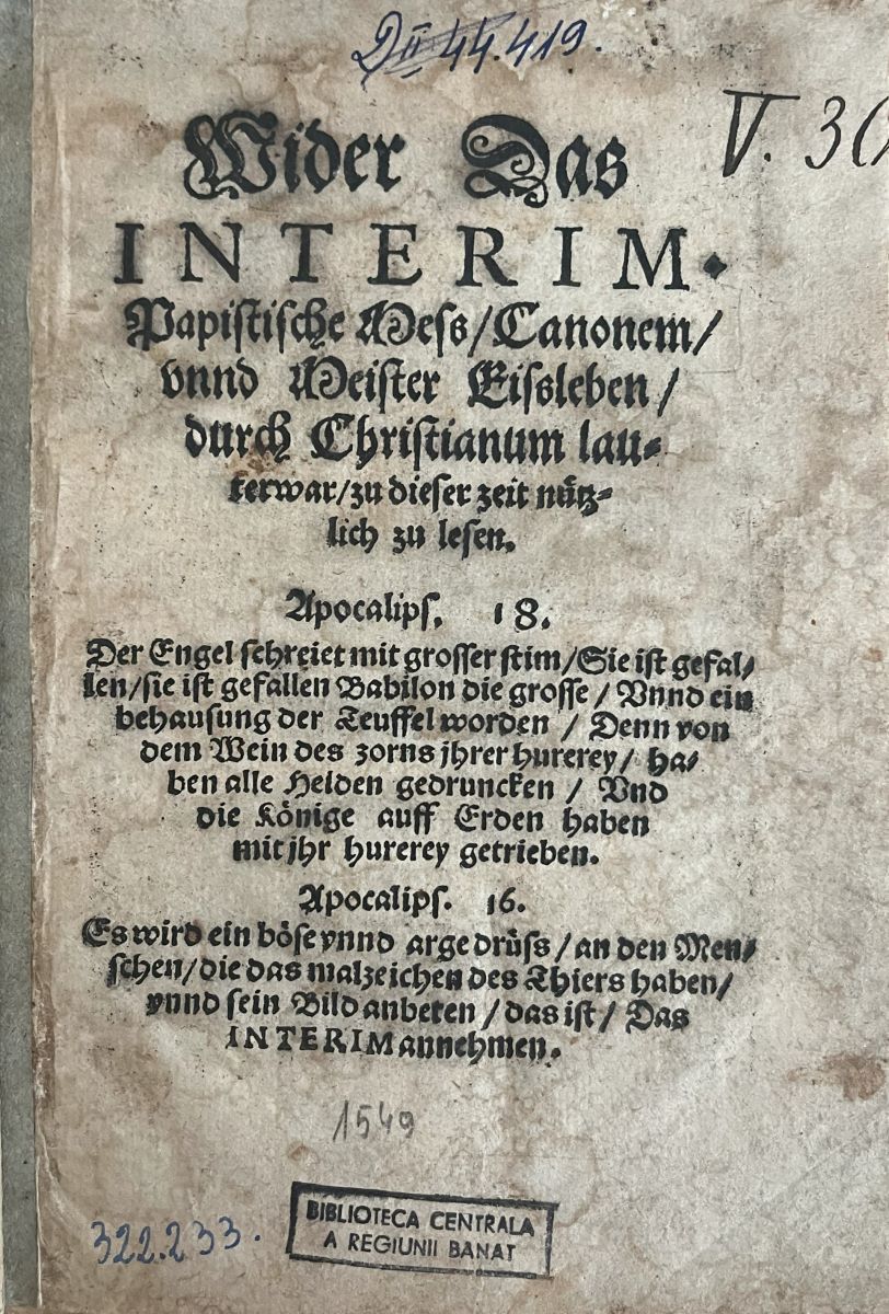 Description: Wider Das INTERIM. Papistische Mess / Canonem / vnnd Meister Eissleuben / durch Christianum Lau= terwar / zu dieser zeit nütz= lich zu lesen. Apocalips. 18. Der Engel schreiet mit grosser stim / Sie ist gefal= len / sie ist gefallen Babilon die grosse / Vnnd ein behausung der Teuffel worden / Denn von dem Wein des zorns jhrer hurerey / ha= ben alle Heiden gedruncken / Vnd die Könige auff Erden haben mit jhr hurerey getrieben. Apocalips. 16. Es wird ein böse vnnd arge drüss / an den Men= schen / die das malzeichen des Thiers haben / vnnd sein Bild anbeten / das ist / Das INTERIM annehmen.