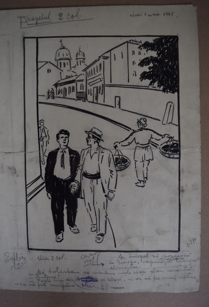 Description: Caricatură de socială, privitoare la politica prețurilor după război. Vedere în perspectivă a unei străzi din București. În prim-plan spre stânga, doi bărbați priviți din mers, în picioare, discută. Cel din stânga este redat frontal, cel din dreapta este ușor răsucit spre stânga. Ambii poartă costum. În dreapta, privit din spate un oltean cară cu cobilița coșuri cu cireșe. În fundal turlele unei biserici. Desen sobru, în alb/negru, prevalent linear, cu zone distincte de lumină și umbră care să faciliteze reproducerea tipografică.