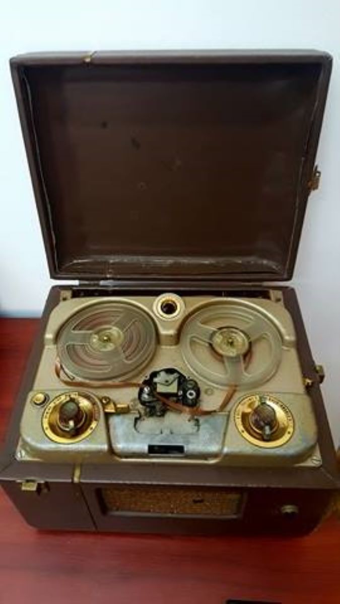 Description: Magnetofonul, prevăzut cu capac, este cu înregistrare pe două piste. Capul de înregistrare are înălțimea întrefierului puțin mai mică decât jumătate din lățimea benzii. Pentru înregistrare banda trece prin dreptul capului de înregistrare, un electromagnet (o bobină cu miez de fier), de la un amplificator electronic ce primeste la intrare „muzica”. Electromagnetul produce un câmp magnetic modulat după "„muzică” și banda rămane magnetizată conform acestei modulații. La redare, bobina electromagnetului este conectată la intrarea unui amplificator. La trecerea benzii prin fața capului se induce în bobina o tensiune modulată dupa câmpul magnetic înregistrat pe banda. Tensiunea este amplificată și apoi aplicată difuzorului. În partea stangă este plasat potențiometru pentru derularea benzii înainte, stop, play, respectiv în dreapta este plasat butonul de închidere, cel pentru volum, iar frontal un buton de înregistrare.