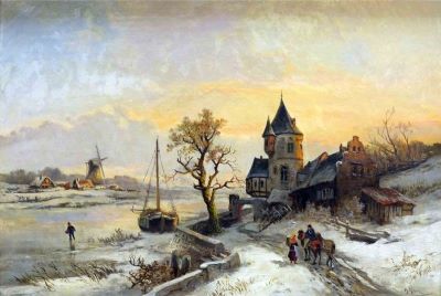 Description: Tabloul înfățișează un peisaj hibernal cel mai probabil fictiv, ale cărui elemente constitutive se revendică în parte din tradiția peisajului olandez din secolul al XVII-lea. Vizualizat de la distanță și de la o înălțime neverosimilă, locul este dominat de o volumetrie arhitectonică hibridă, cu aspectul compozit și implauzibil al unui han cu donjon și absidă de biserică. Către această construcție, situat la marginea unui râu cu malurile consolidate de un parapet, par a se îndrepta două personaje, alături de doi cai. Un al treilea personaj, stingher, este vizibil în stânga, pe gheața râului, în proximitatea unei ambarcațiuni de dimensiuni medii, cu un singur catarg. Pe celălalt mal se vede un cătun, de asemenea dominat de o moară de vânt, ale cărui case sunt însă disproporționat de mari în raport cu distanța. Scăldat într-o lumină aurorală, nu lipsită de o anume sugestivitate sticloasă, de dimineață geroasă, acest cadru panoramic pare să evoce, într-o notă mai curând romantică, duritatea și farmecul vieții din ținuturile nordice.