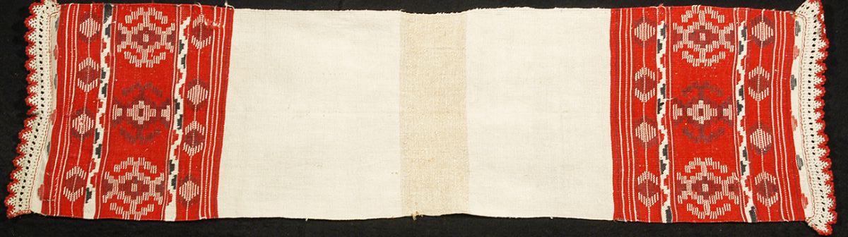 Description: Ștergar urzit și țesut la războiul de țesut în casa tărănescă, de formă dreptunghiulară. Urzit și țesut în două ițe, cu urzeală de cânepă și băteală de cânepă și bumbac. Ornamentat la capete prin vrâste late dispuse pe lățimea ștergarului care au în interiorul lor inserate motive ornamentale precum roata cu cârlige sau prescura și pristornic, dârlu, calea cea mare. Vrâstele sunt alese cu suveica, cu cordenciul pentru ridicarea firelor și cu suveica printre firele de urzeală, cu mâna și ghemuțul peste și pe sub firele de urzeală. Pe mijlocul ștergarului băteala este din cânepă grosieră pe un spațiu mic, dând aspect cromatic diferit. La capete este tivit cu bumbac de culoare roșie, dantelă prinsă de tivitură și croșetată din fir de bumbac din comerț și croșetată cu mâna și acul de croșetat. Colțișorii dantelei sunt ornamentați la margine prin croșetatre cu bumbac de culoare roșie. Domeniul de folosință- decorarea interiorului țărăneasc. Cromatică ștergarului: culoarea naturală a cânepii, alb, roșu, negru.