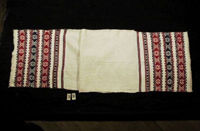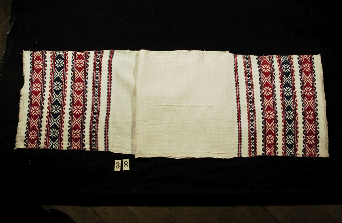 Description: Ștergar de formă dreptunghiulară, realizat în casa țărănească la războiul de țesut tradițional, dintr-un singur lat de țesătură, urzit și țesut în două ițe, din urzeală de cânepă și băteală de cânepă și bumbac. De formă dreptunghiulară, format dintr-un singur lat de pânză.Ornamentat la capete prin alesătură realizată cu mâna cu ghemuțul peste firele de urzeală, cu speteaza pentru ridicarea firelor de urzeală și cu suveica printre firele de urzeală. Ornamentele sunt țesute pe băteală de bumbac acesta fiind prezentă doar la capete iar pe podul ștergarului băteala este din cânepă. Motivele ornamentale sunt dispuse pe lățimea ștergarului prin frize înguste în care sunt alese motive precum capra (de tăiat lemne), motive florale stilizate, ghiara, dârlu. Frizele alternează cromatic, la fiecare capăt sunt dispuse trei frize sub forma de vrâste late în care sunt încadrate motivele ornamentale și două vrâste înguste dispuse spre mijlocul ștergarului. Cele două vrâste înguste sunt diferite, una are spect de friză mai ingustă în care sunt încadrate motivele numite roata (rombul) și capra (de tăiat lemne). Cea de-a doua vrâstă este aleasă cu suveica pe sistemul firului dus- întors, și în degete cu motivul numit dinții calului. La capete ștergarul prezintă tivitură cu ochiuri realizată cu acul de cusut, în tehnica numită dinainte acului, în care este scos un fir de băteală și apoi grupate câte patru fire de urzeală și strânse la mijolc pentru a forma spărtura.Terminația ștergarului s-a realizat prin franjuri tăiați la capăt, realizați prin îndepărtarea bătelii din pânză după ce a fost tivit. Cromatica ștergarului este albă, culoarea naturală a cânepii, roșu și negru. Domeniul de folosință - decorarea interiorului țărăneasc, folosit la anumite evenimente importante din viața omului sau la sărbătorile de peste an.