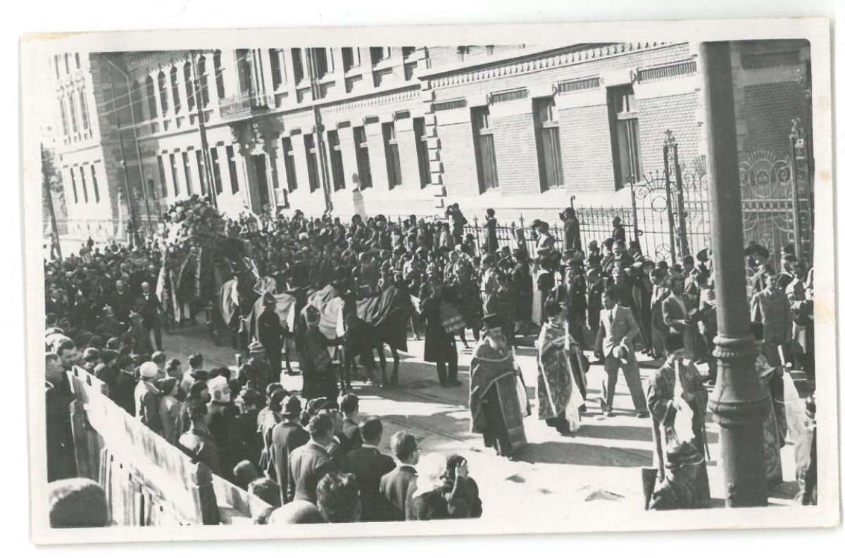 Description: Fotografie tip carte poștală, necirculată, alb-negru, ce surprinde cortegiul funerar ce însoțește pe scriitorul George Topîrceanu pe ultimul său drum, de la Academia de Belle Arte, unde fusese depus, către Cimitirul Eternitatea, unde a fost înmormântat. Fotografia este realizată în dreptul Colegiului Național din Iași. Verso, liniatură specifică cărții poștale; ștampila atelierului foto, tuș violet, caractere cursive. Tipărit pe hârtie fotografică cu marca „Agfa”.
