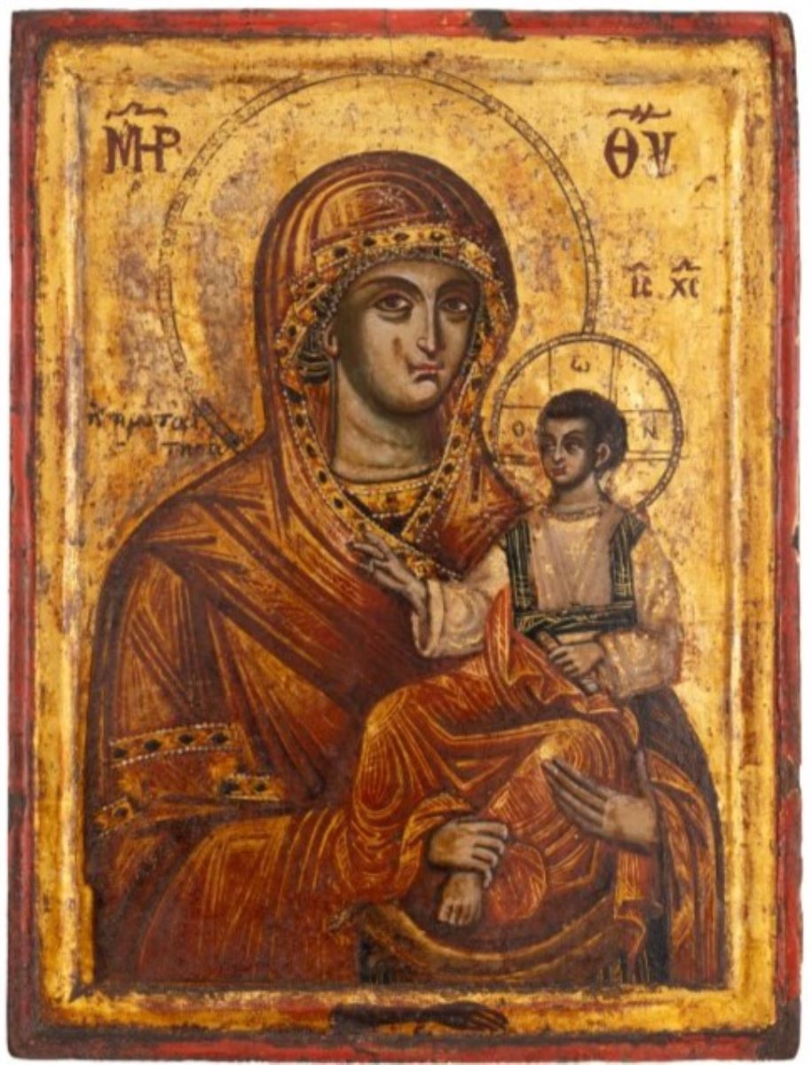 Description: De mici dimensiuni, icoana a fost destinată, probabil, unei folosințe private. Pe fondul auriu al icoanei este înfățișată până mai jos de mijloc, Maica Domnului cu Pruncul în brațe, care ține cu mâna stângă un rotulus și cu dreapta binecuvântează, reprezentare care se încadrează în tipul Hodigritia, Îndrumătoarea. Însă, unele particularități, cum sunt gestul Fecioarei care strânge cu ambele mâini la piept Pruncul Iisus, ușoarea aplecare a capului către Prunc, privirea sa gânditoare, fac referire la un alt tip, și anume la tipul Eleusa. Maica Domnului este înveșmântată într-un maforion roșu-vișiniu, tivit cu un galon auriu decorat cu perle și pietre prețioase, drapat în cute unghiulare, iar Iisus-copil poartă un chiton alb și un himation roșu-ocru, hrisografiat. Ambii au în jurul capului aureole decorate cu rotiță. Chipurile, realizate după tipic, sunt modelate în tradiția picturii cretane în nuanțe de ocru, plecând de la umbra brun-verzuie către părțile luminate, prin treceri relativ brusce. Câmpul icoanei este încadrat de o ramă degroșată, dublu profilată, pictată cu auriu și roșu