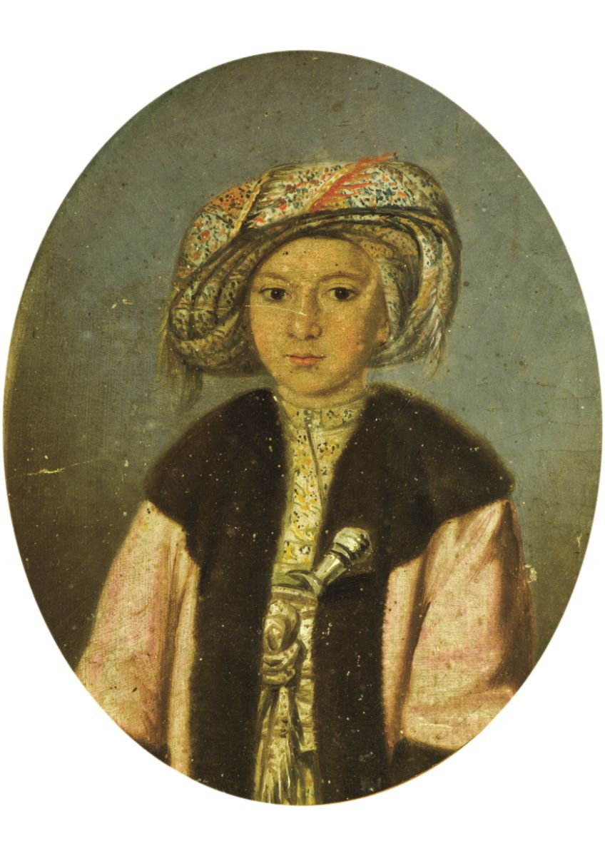 Description: Lucrarea de mici dimeniuni înfățișează portretul de copil al Izei Ghica în costum oriental care imită vestimentația masculină. Fetița este redată frontal cu chipul rotund și ochii mari, cu capul acoperit de un taclit înflorat în nuanțe de albastru și roșu. Ea poartă un anteriu alb cu motive galbene strâns cu o eșarfă pe mijloc. Aici are un mic pumnal. Peste ele are o giubea rozalie cu inserții de blană pe umeri. Fundalul este redat într-o nuanță de albastru. Lucrarea prezintă o rețea de cracluri și murdărie încastrată.