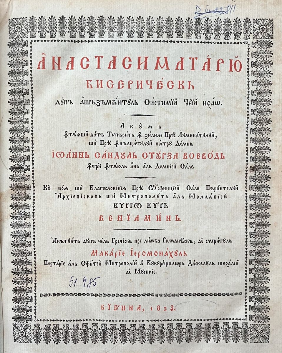 Description: Anastasimatariu bisericesc după așăzământul sistimii cei noao. Acum întâiași dată tipărit, în zilele prealuminatului și preaînălțatului nostru domn Io Grigorie Dimitrie Ghica Voievod, întru întâiul an al domniei sale, cu voia și blagosloveniia Preaosfinției Sale, părintelui mitropolit a toată Ungrovlahiia, chirio chir Grigorie. Alcătuită după cel grecesc pre limba romanească de smeritul Macarie ieromonahul, portarie al sfintei Mitropolii a Bucureștilor, dascalul școalei de musichie. Viena, 1823.
