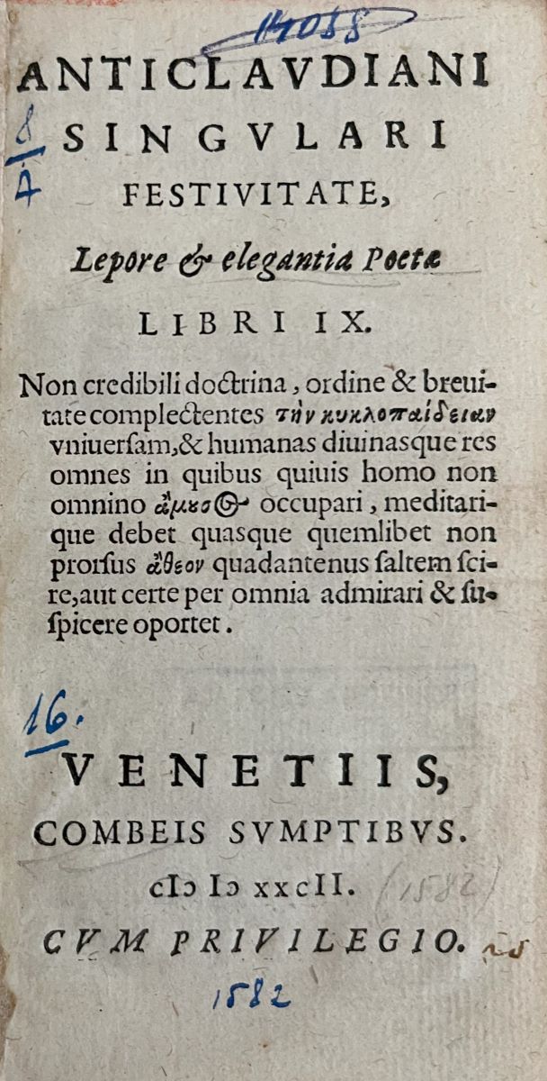 Description: Anticlavdiani singvlari festivitate, lepore & elegantia Poetæ, libri IX : non credibili doctrina, ordine & breuitate complectentes tēn kyklopaideian vniuersam, & humanas diuinasque res omnes in quibus quiuis homo non omnino ... occupari, meditarique debet quasque quemlibet non prorsus atheon quadantenus saltem scire, aut certe per omnia admirari & suspicere oportet. Venetiis, Combeis sumptibus. M. D. XXCII [1582]. Cum privilegio