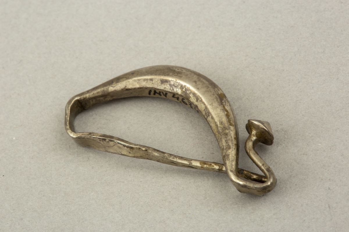 Description: Fibulă de tip tracic cu resort unilateral, format dintr-o spiră completă. Arcul îngroșat și fațetat (opt fețe) continuă cu piciorul în forma literei S, care se termină cu un buton conic.